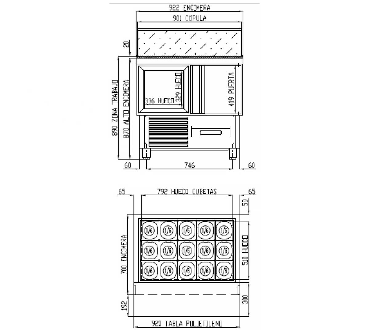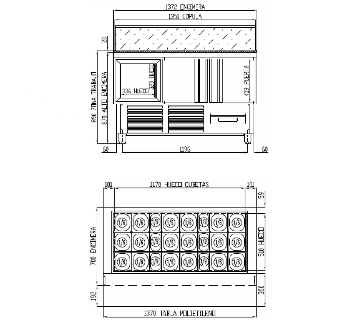 Mesa refrigerada de preparación de alimentos. El exterior e interior son acero inoxidable. Exterior e interior en acero inoxidable. El rango de temperatura es de 0 a +8 ºC. Encimera inox con tabla de polietileno deslizante color blanco. Tiene cúpula acristalada. Las cubetas gastronorm no están incluidas.