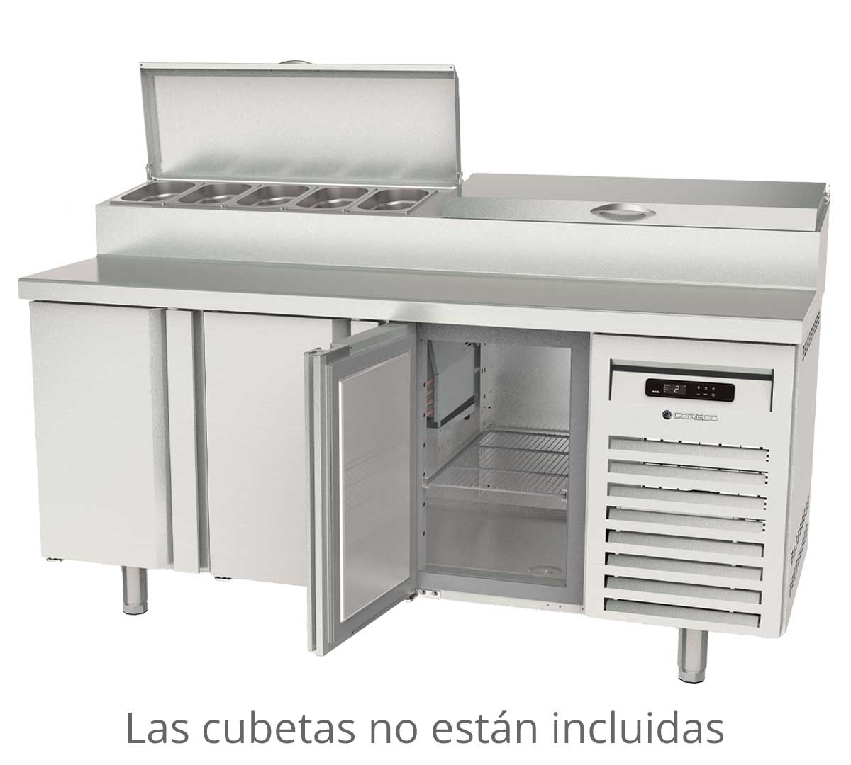 Esta mesa fría está especialmente indicada para la preparación y conservación de ingredientes frescos en cocinas profesionales, pizzerías, restaurantes de comida rápida, locales de ensaladas y cualquier establecimiento que requiera un acceso ágil y seguro a productos refrigerados durante el servicio. Su diseño facilita la preparación eficiente de platos fríos, ensaladas, bocadillos y pizzas, manteniendo siempre la cadena de frío.