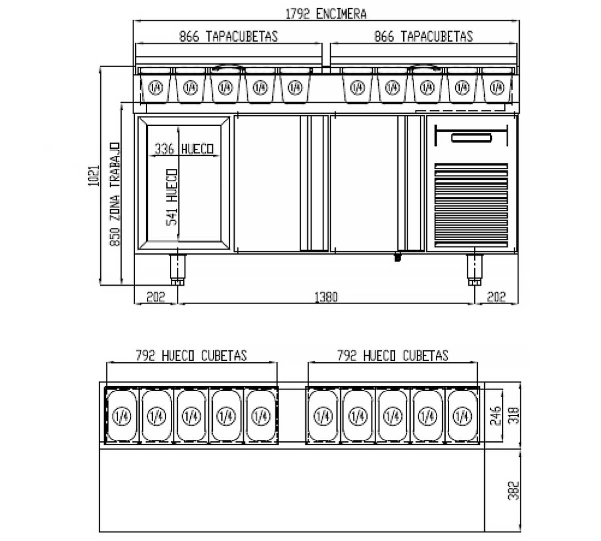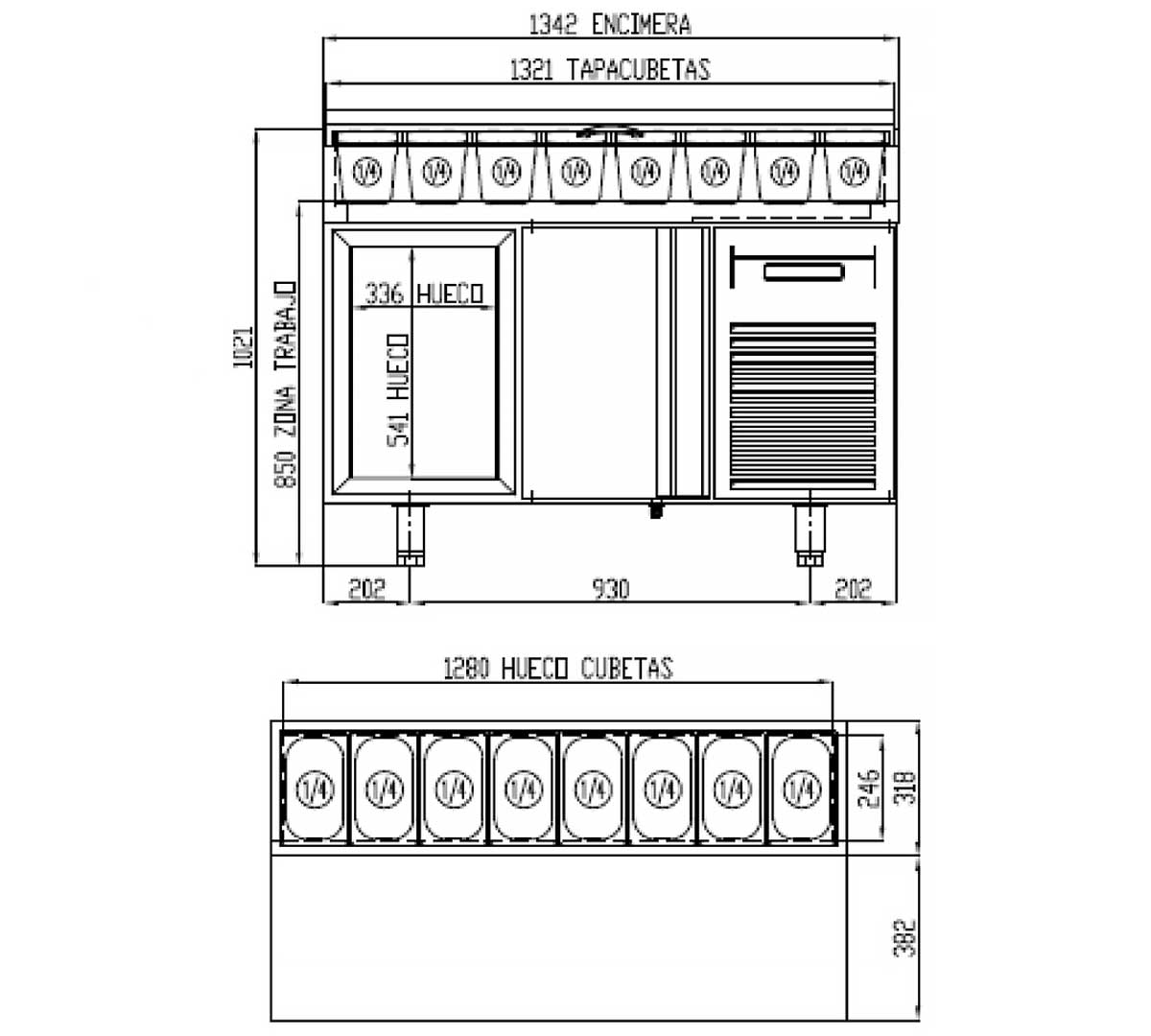 Mesa refrigerada de preparación de alimentos gama 700 con encimera inox y expositor de ingredientes integrado para cubetas GN 1/4 con una profundidad de 15 cm. Dispone de cubierta inox abatible. Tiene un rango de temperatura de 0 a +8 ºC. Las cubetas gastronorm no están incluidas. Incluye parrillas interiores GN 1/1 de alambre en acero plastificado.