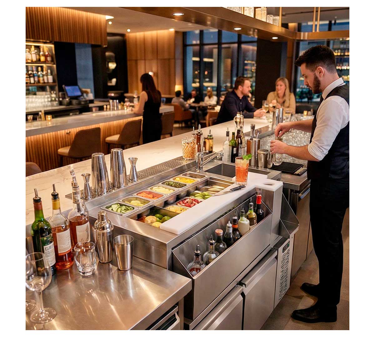 Esta completa mesa fría coctelera cuenta con moja vasos, recipiente para desperdicios y dos tablas de corte y golpeo.