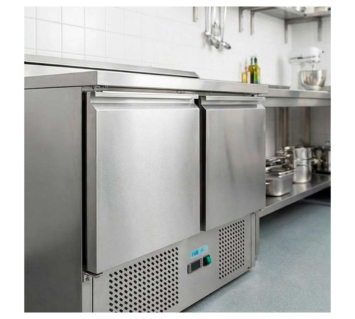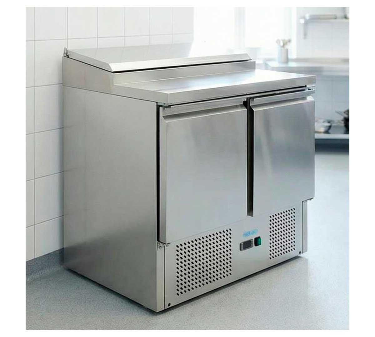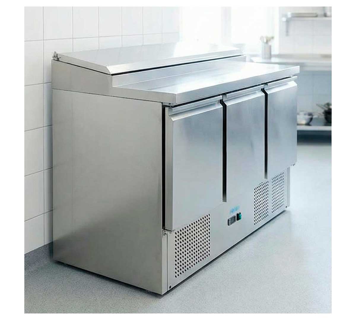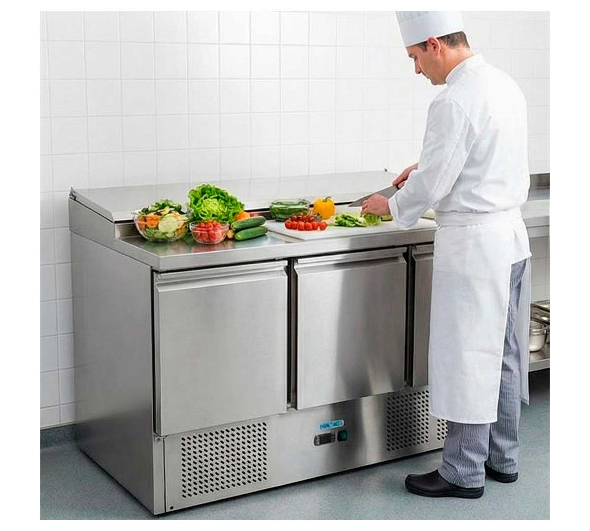Mesa refrigerada para ensaladas de 2 o 3 puertas. La descongelación es automática y la refrigeración estática. El control también es automático. Las cubetas gastronorm no están incluidas.