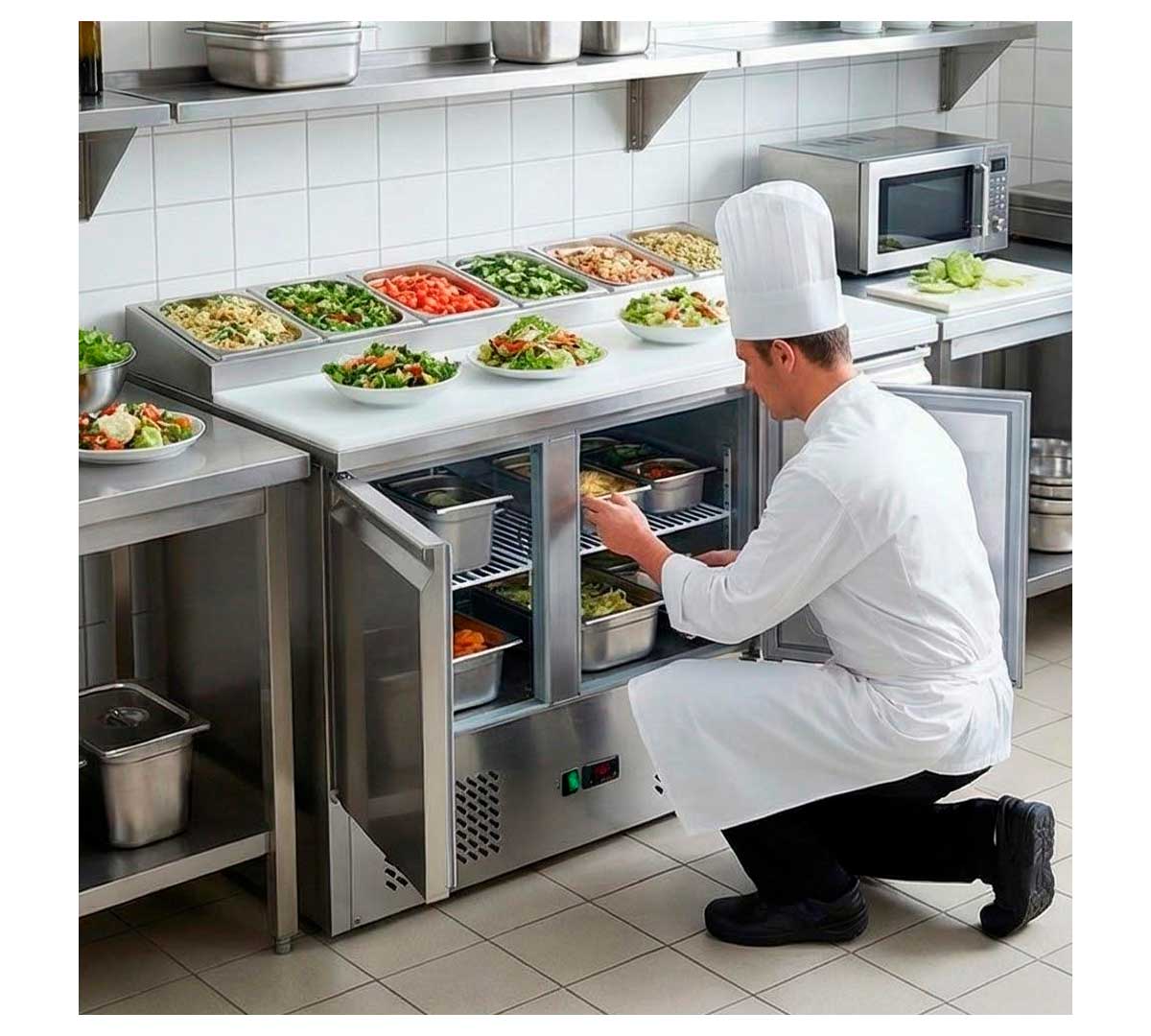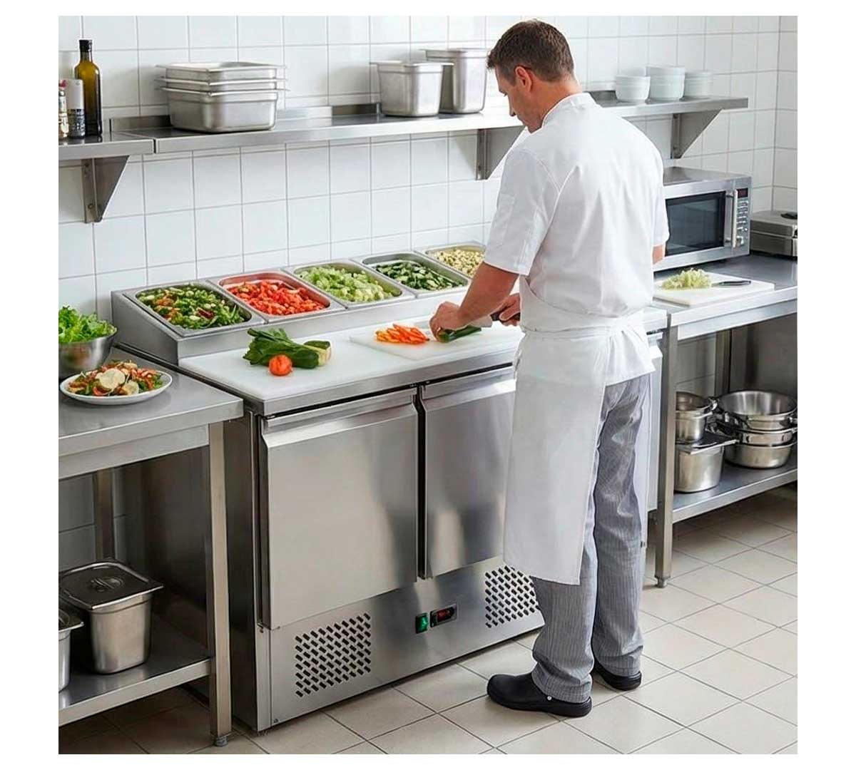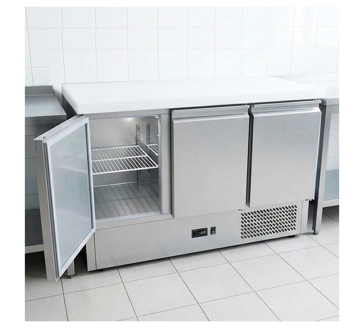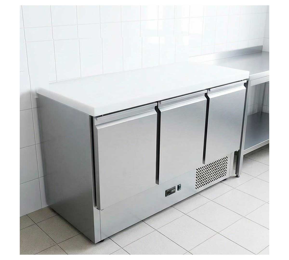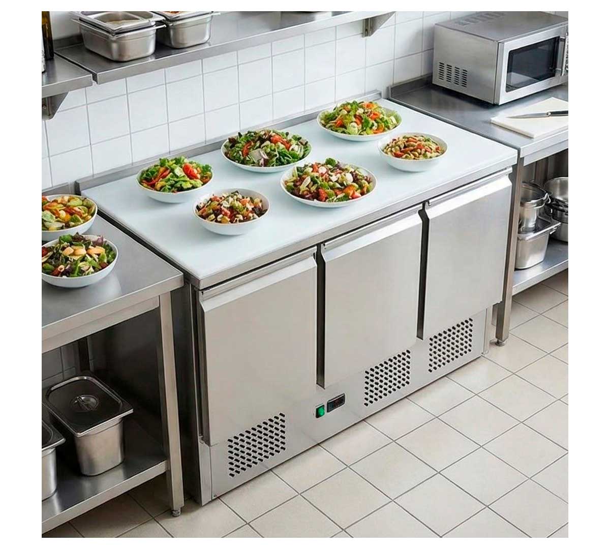 Mesa refrigerada para preparación de ensaladas con 3 puertas. Con encimera de polietileno, refrigeración estática y termostato electrónico. Incluye 3 pares de guías y 3 rejillas GN 1/1.