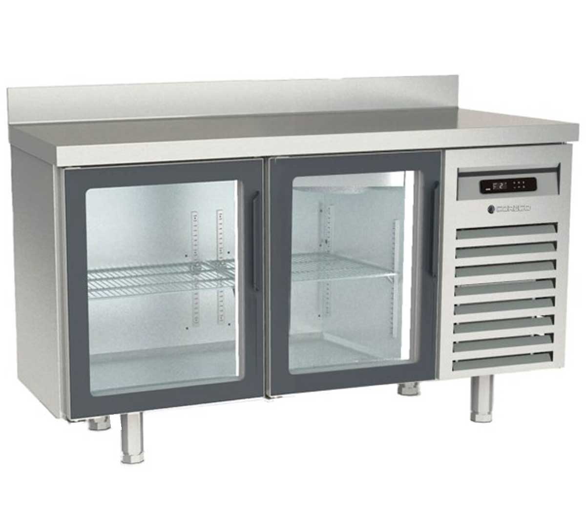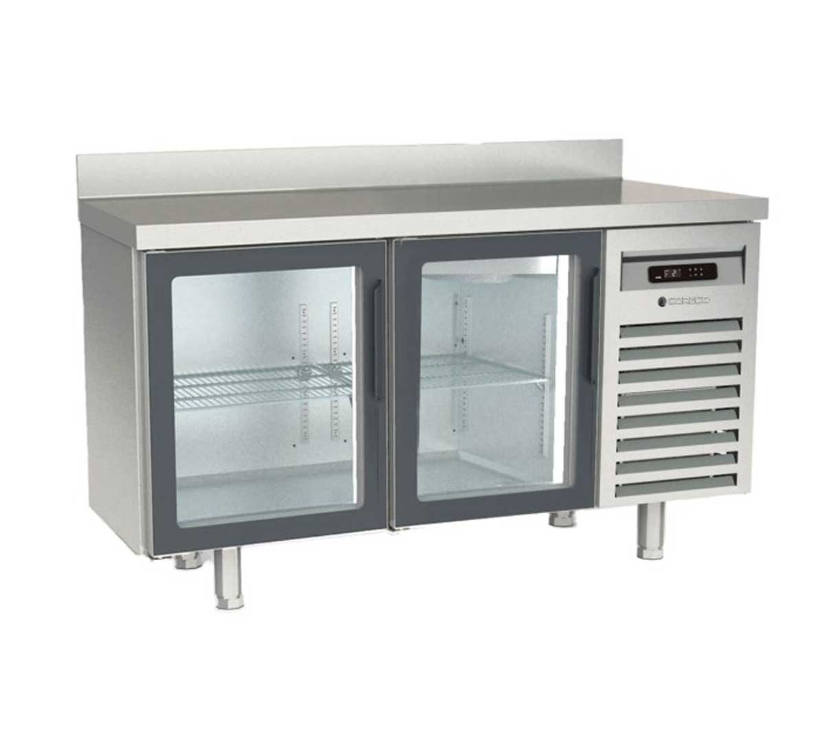 Mesa refrigerada con puertas de cristal. Forma parte de la gama 600 Snack. Dispone de control digital de temperatura y sistema de descarche optimizado. Tiene una altura de 85 cm. El rango de temperatura es de -2 ºC a +8 ºC. Incluye parrillas de acero plastificado.