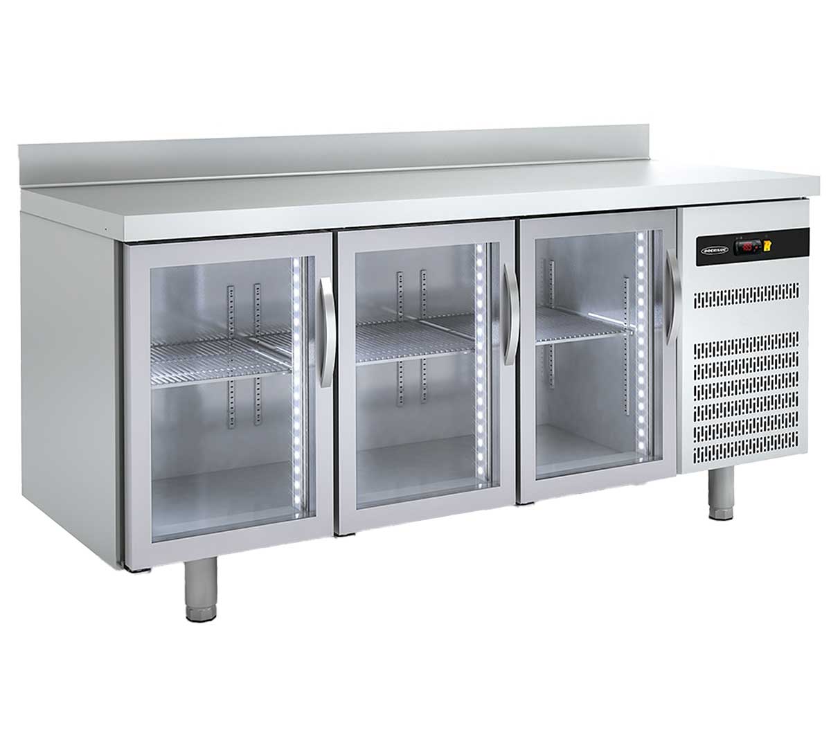 Mesa fría fabricada en acero inoxidable AISI-304, con aislamiento de poliuretano inyectado, control digital de temperatura, iluminación led y puertas de vidrio doble securizado. Ofrece un rango de temperatura de -2ºC a +8 ºC. Incluye estantes de varilla de acero plastificado y tiene un fondo de 70 cm.