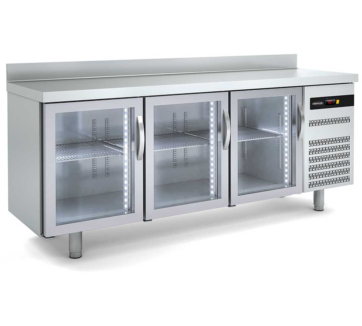 Mesa fría fabricada en acero inoxidable AISI-304, con aislamiento de poliuretano inyectado, control digital de temperatura, iluminación led y puertas de vidrio doble securizado. Con un rango de temperatura de -2ºC a +8 ºC. Incluye estantes de varilla de acero plastificado y tiene un fondo de 60 cm.