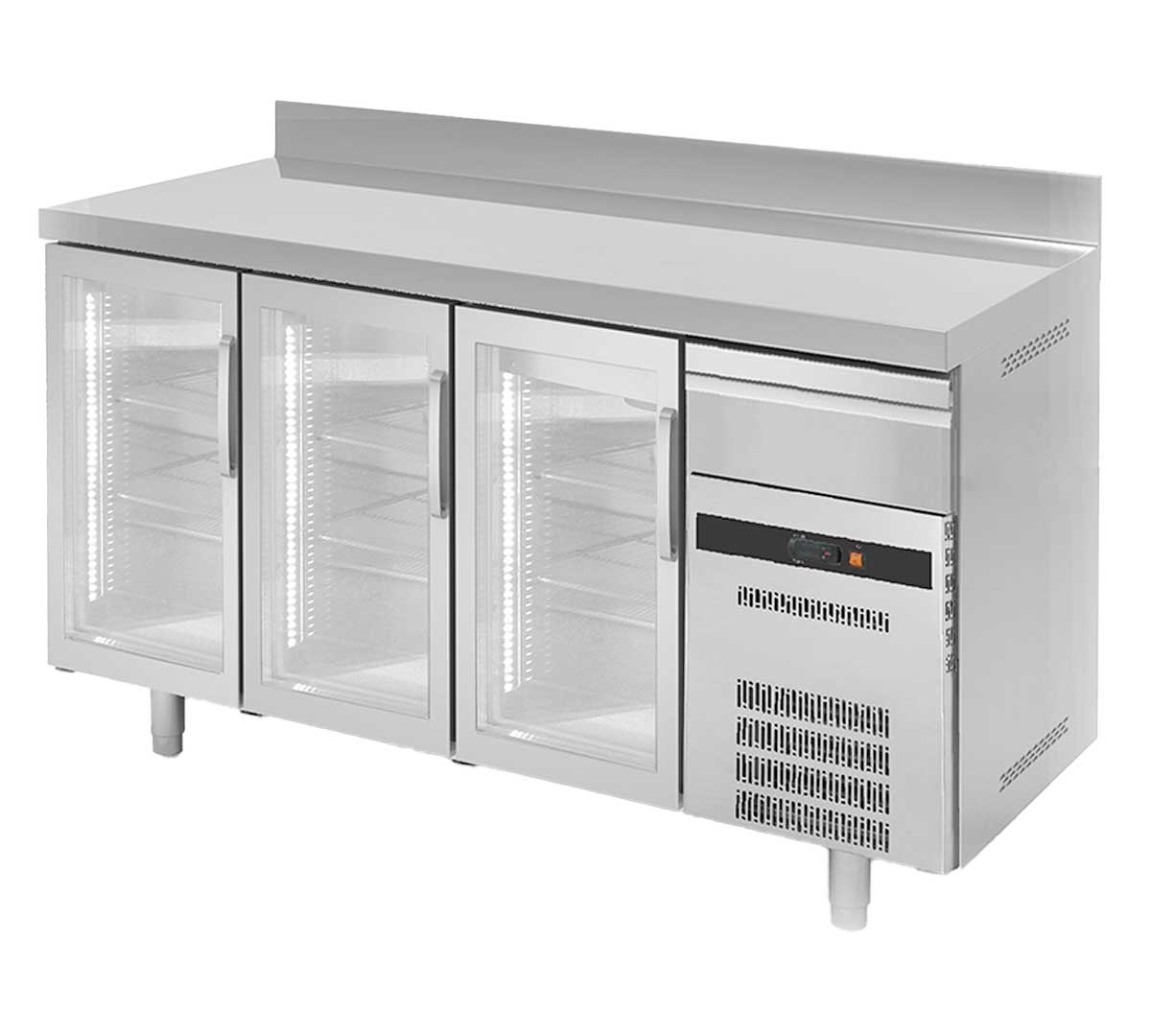 Mesa fría fabricada en acero inoxidable AISI-304, con aislamiento de poliuretano inyectado, control digital de temperatura, iluminación led y puertas de vidrio doble securizado. Con un rango de temperatura de -2ºC a +8ºC. Diseño con puertas reversibles y 2 cajones. Incluye estantes de varilla de acero plastificado regulables.