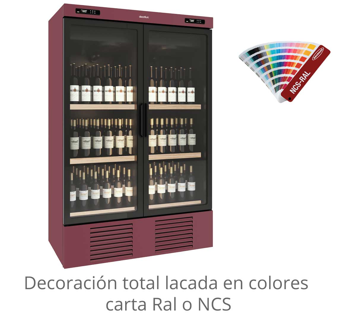 Este armario expositor de vinos o vinoteca es perfecto para la conservación y exhibición de vinos tintos, blancos, rosados y espumosos en restaurantes, bares, hoteles y vinotecas. Gracias a sus dos compartimentos independientes, permite almacenar simultáneamente diferentes tipos de vino, manteniendo cada uno a la temperatura ideal para su servicio.