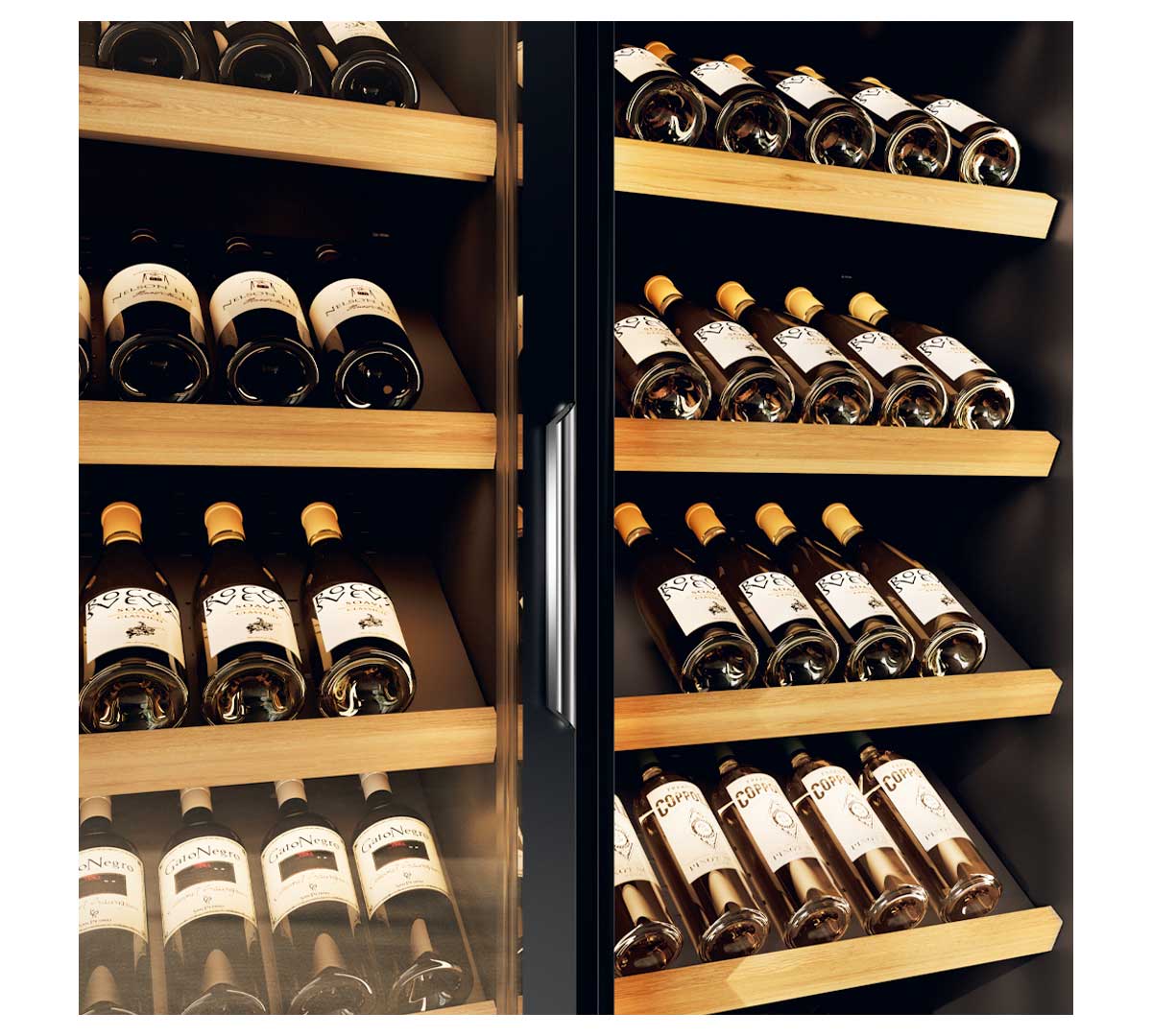 Este armario refrigerado para vinos destaca por su doble compartimento con control independiente, lo que permite almacenar diferentes tipos de vino en el mismo equipo, adaptando la temperatura según las necesidades de cada variedad.