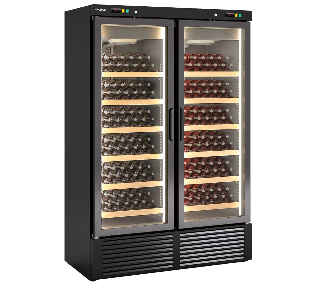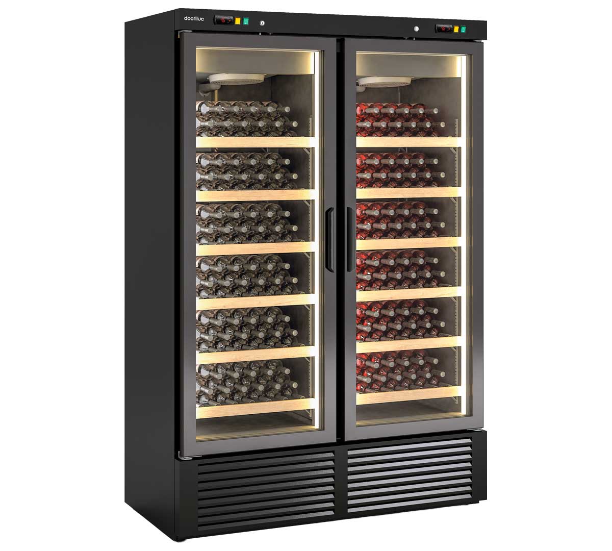 Armario refrigerado para vinos con 2 departamentos independientes con un rango de temperatura cada uno de +4 a +18°C. Está equipado con iluminación led, sistema de refrigeración ventilada. El interior es de acero inoxidable o de acero aluminio negro. Las puertas son de vidrio doble. Incluye cerradura y 12 estantes inclinables en acero AISI-304 con frontal en madera.