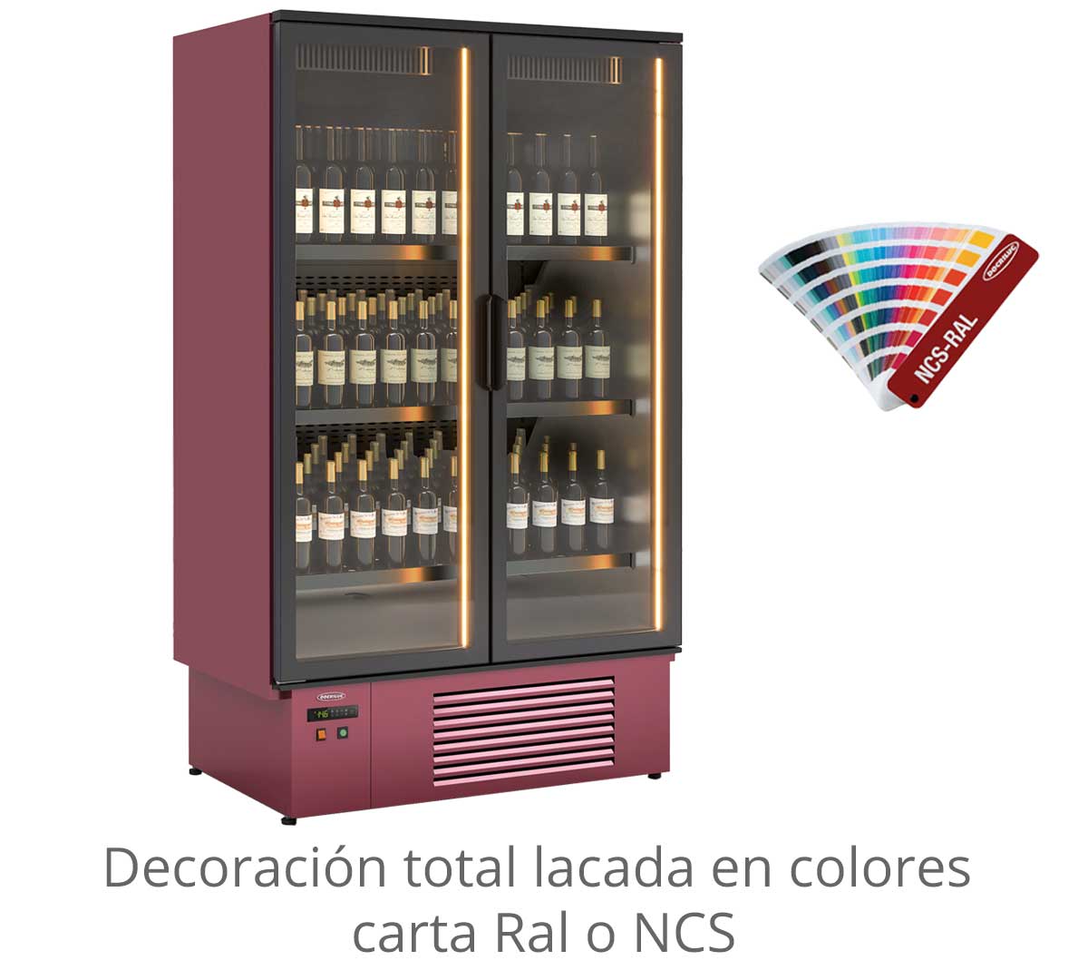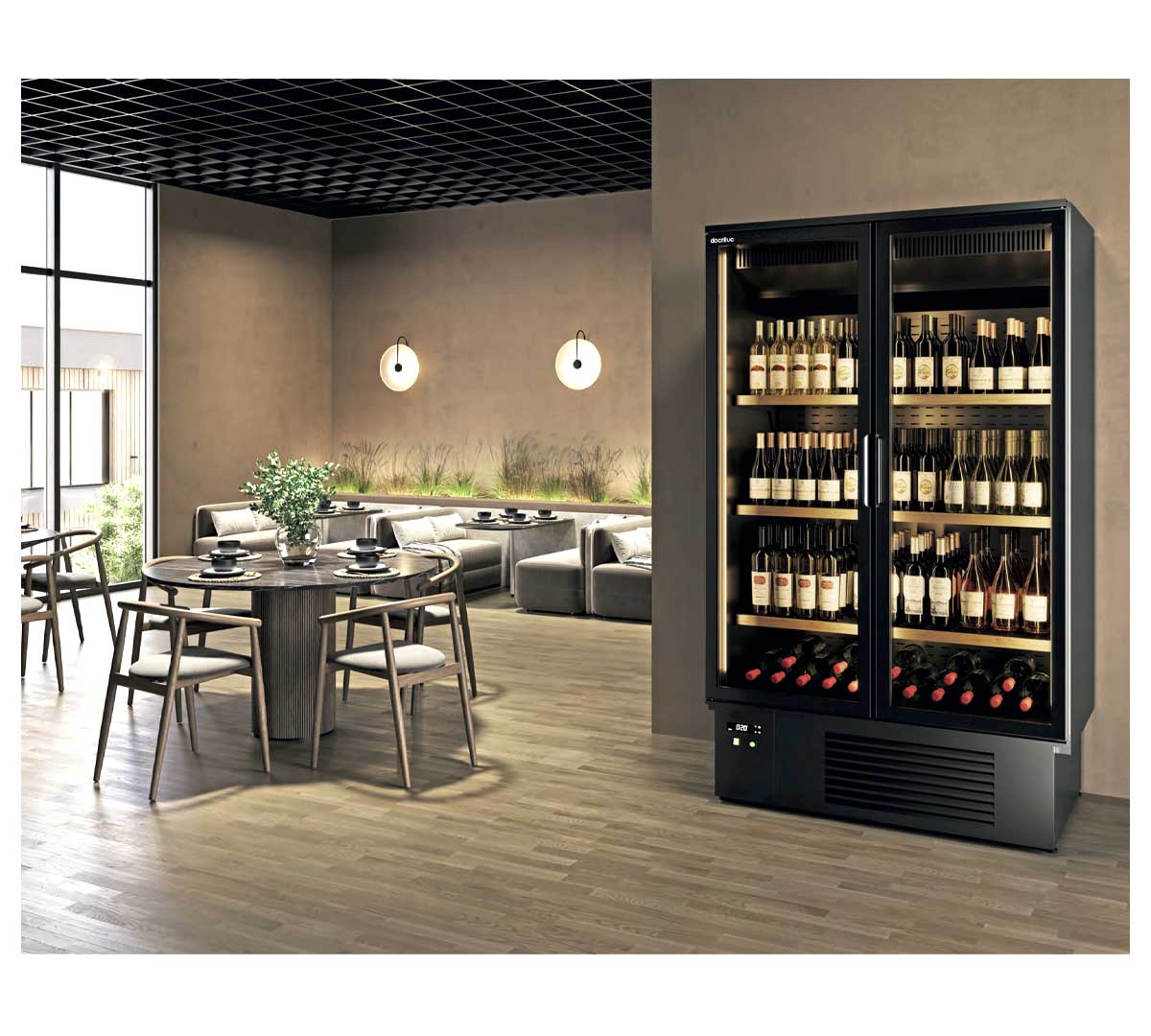 Vinoteca fabricada en acero plastificado negro con 2 puertas full glass con doble acristalamiento. Equipada con refrigeración ventilada, iluminación LED y gas ecológico R-290, combina eficiencia energética, bajo impacto ambiental y una presentación cuidada. Incluye 3 estantes inclinables de acero pintado con frontal de madera.