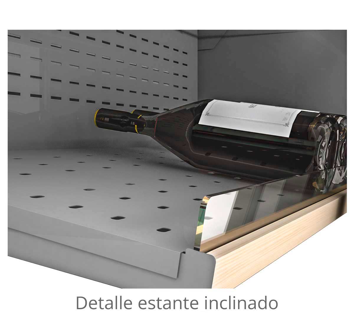 Vinoteca fabricada en acero plastificado negro con 3 puertas full glass con doble acristalamiento. Equipada con refrigeración ventilada, iluminación LED y gas ecológico R-290, combina eficiencia energética, bajo impacto ambiental y una presentación cuidada. Incluye 6 estantes inclinables de acero pintado con frontal de madera.