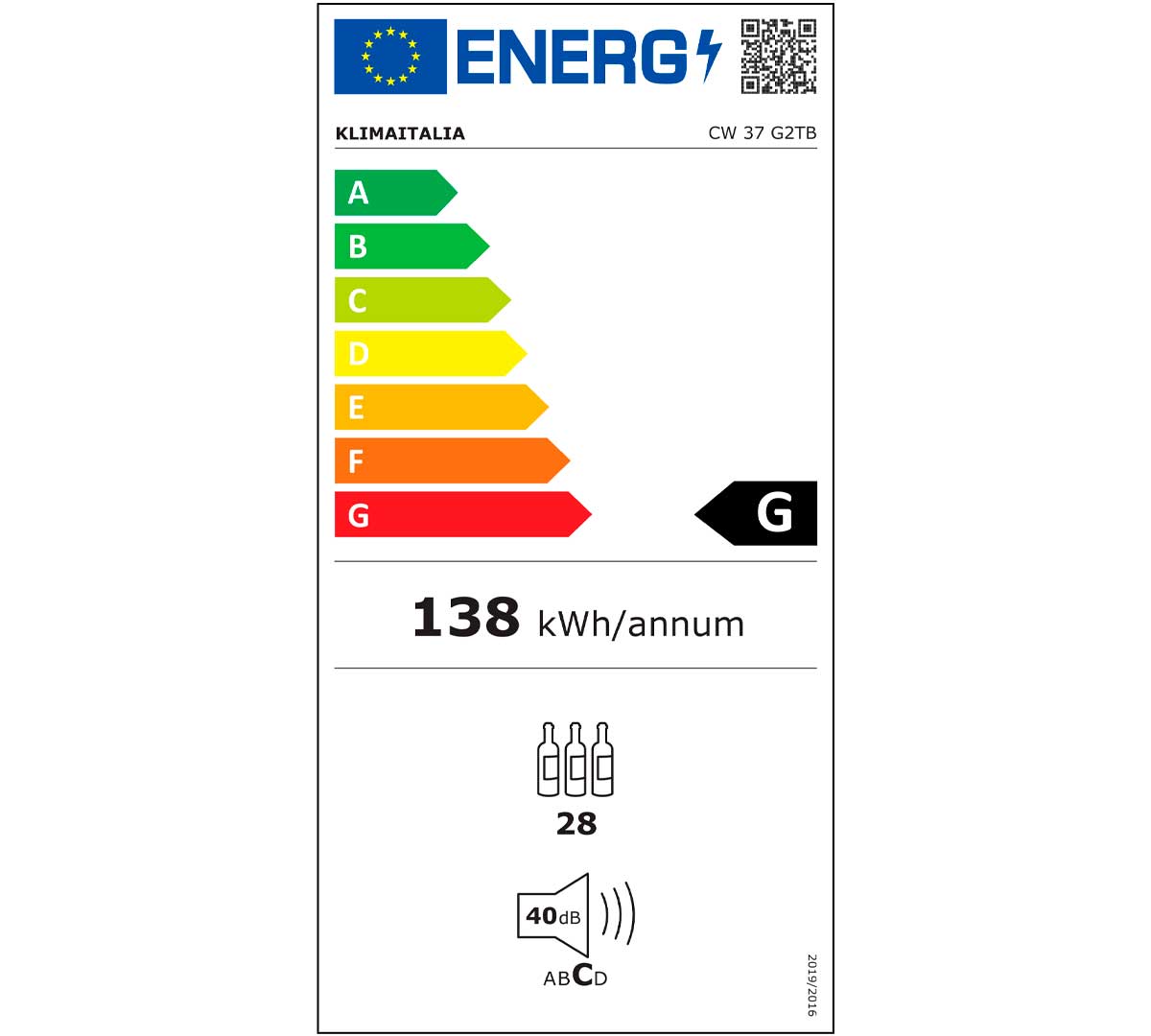 La vinoteca CW 37 G2TB tiene etiqueta de eficiencia energética clase G, según el reglamento UE 2019/2016.