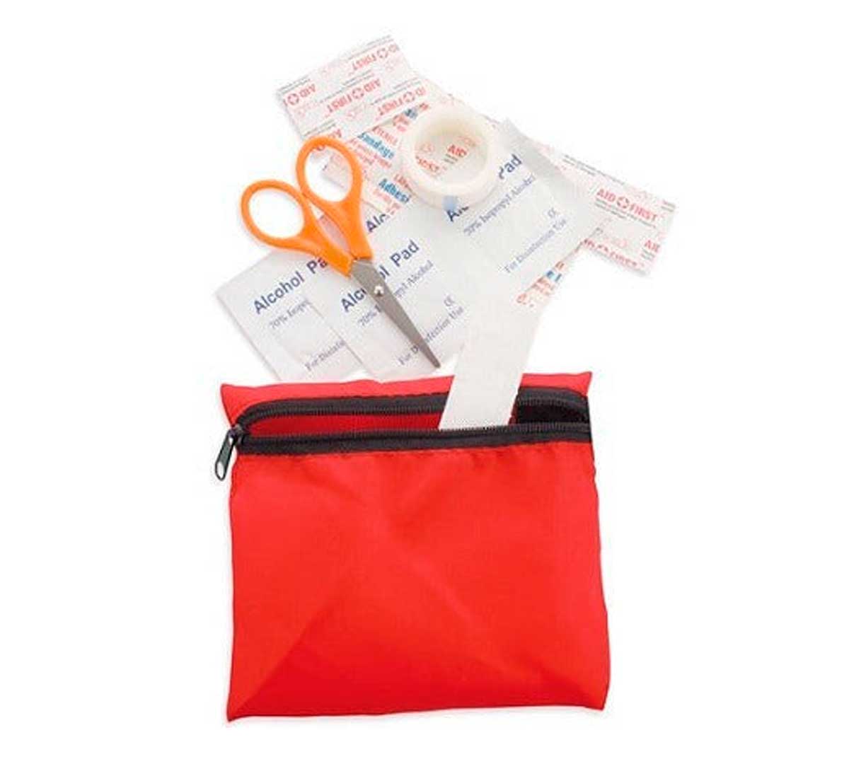 Botiquín económico de primeros auxilios para apartamentos turísticos, con tijeras, curitas, gasa, toallitas y cinta adhesiva. Disponible en versión estándar o personalizada con el logo de su empresa.