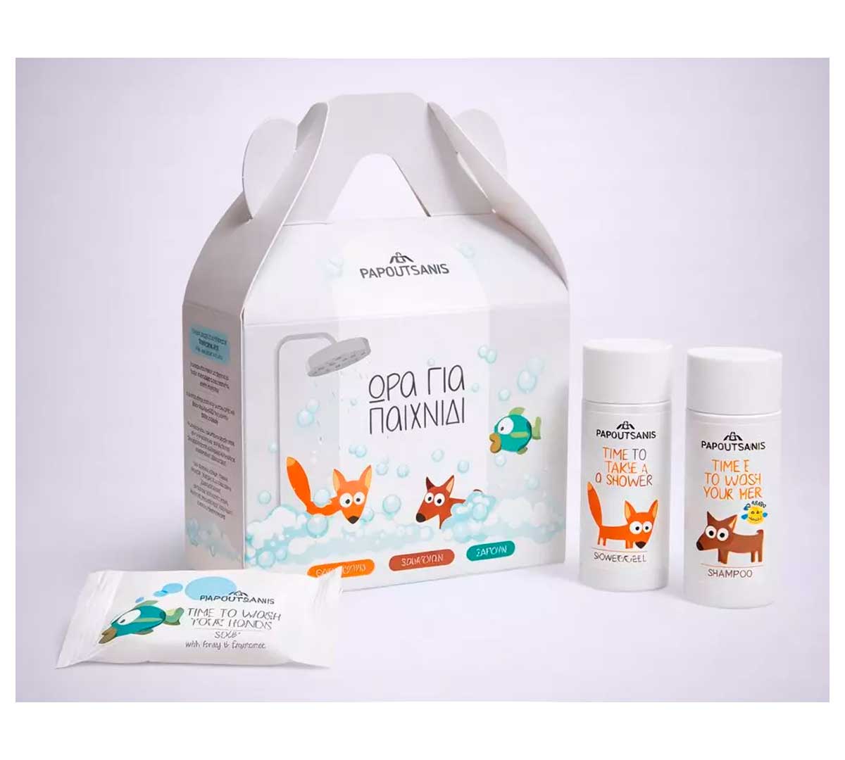 Caja de regalo infantil con champú, gel de ducha y pastilla de jabón suaves, de origen natural, sin alérgenos, parabenos, siliconas ni colorantes, adecuados para piel y ojos sensibles.