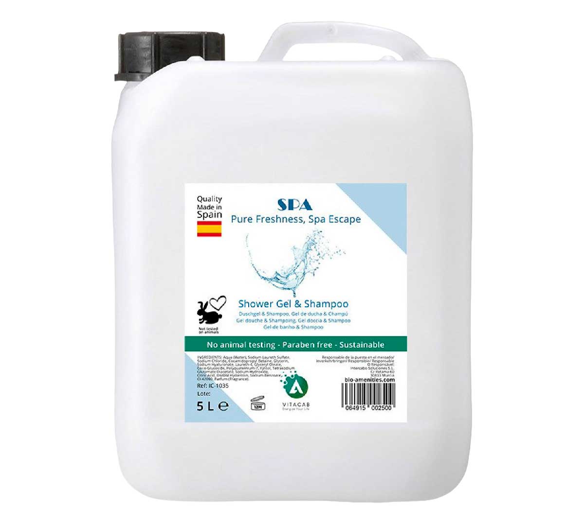 El Gel de Ducha y Champú SPA 2 en 1 se presenta en garrafa profesional de 5 litros, combinando limpieza corporal y capilar con fórmula suave y aroma fresco tipo spa.