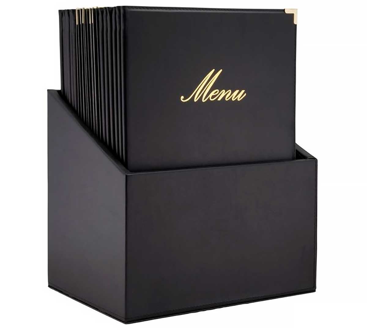 Caja de carpetas de menú A4, es una solución elegante y profesional para la presentación de cartas en restaurantes. Incluye 20 portamenús clásicos en una caja de almacenamiento a juego, ofreciendo orden, durabilidad y una imagen cuidada en sala.