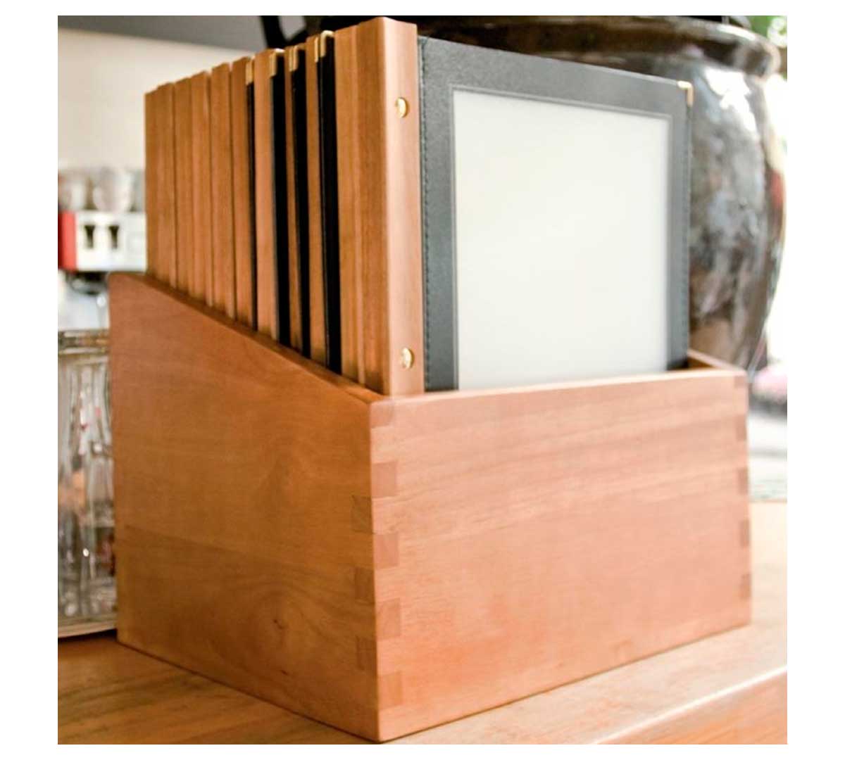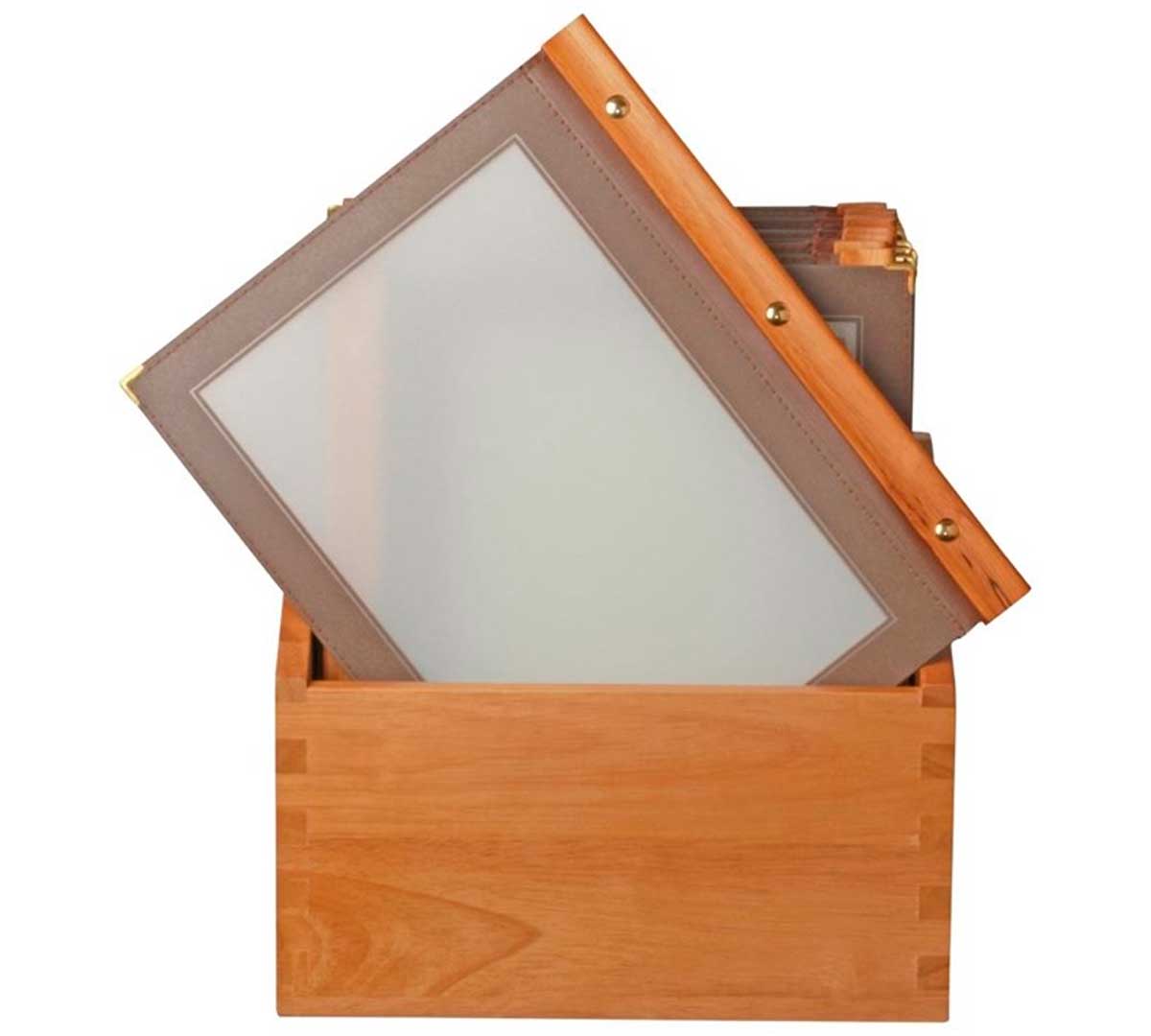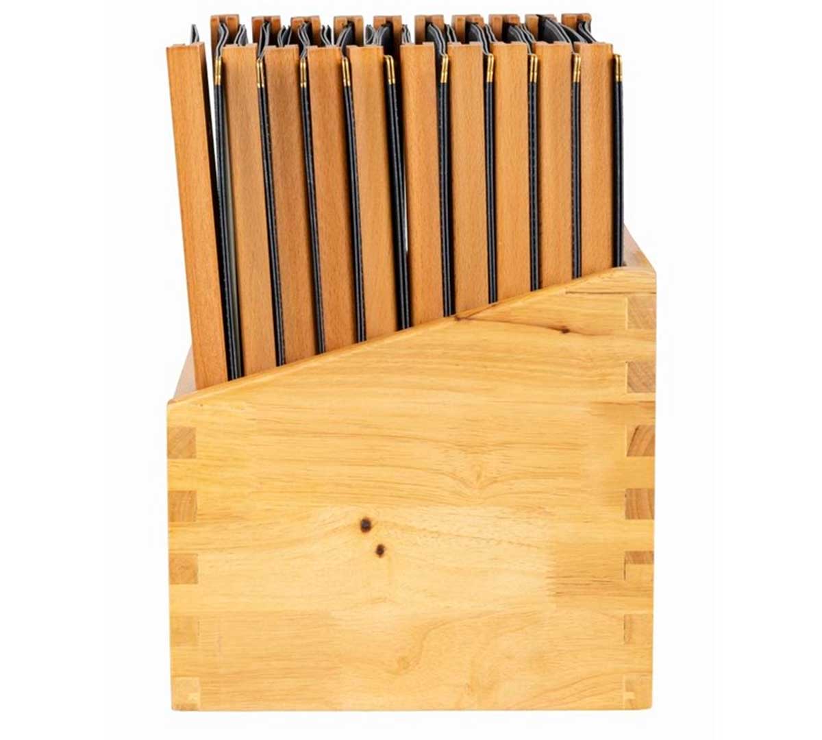 Solución práctica para organizar y presentar menús. Incluye caja de madera y fundas para menús en formato A4. Diseño funcional y resistente para uso diario en sala.