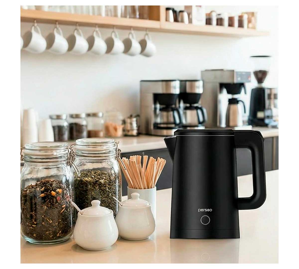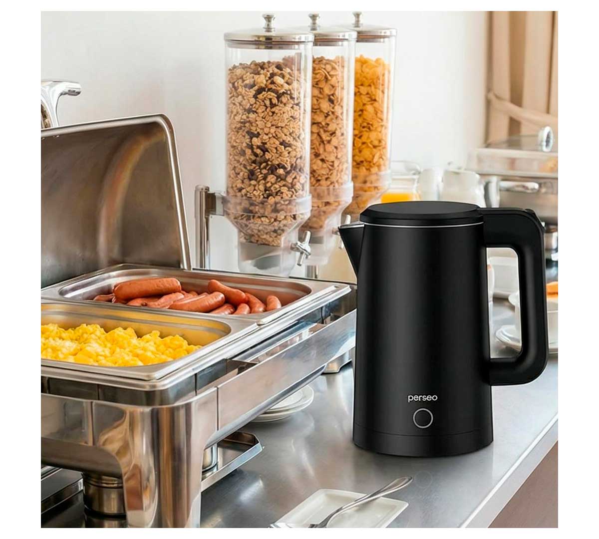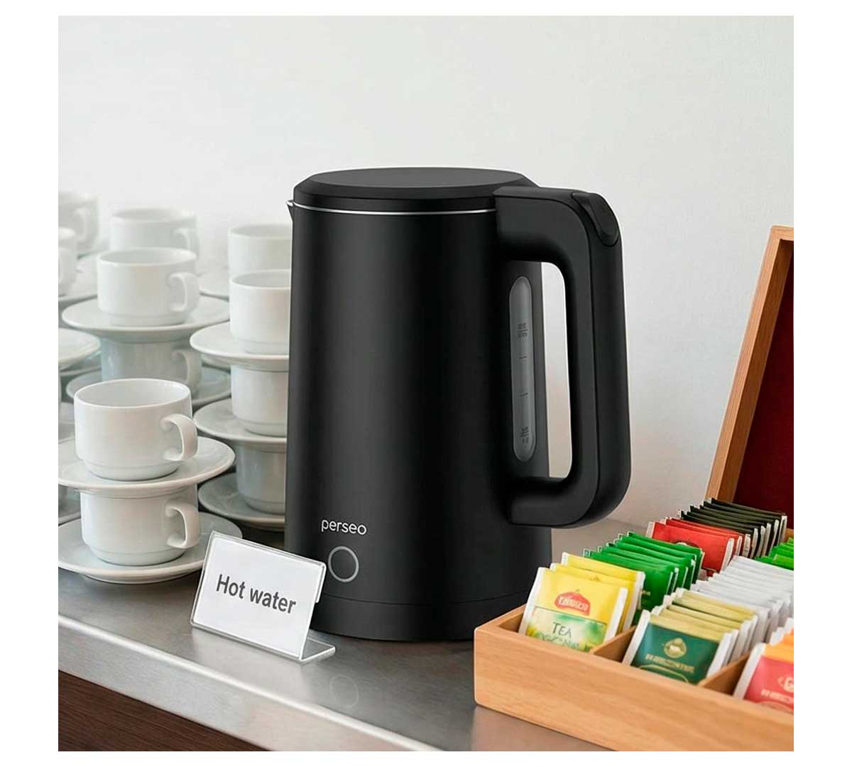 El Hervidor Serene de Perseo by BTV recomendado para las habitaciones de hoteles. Está fabricado en acero inoxidable AISI 304 pintado en negro.