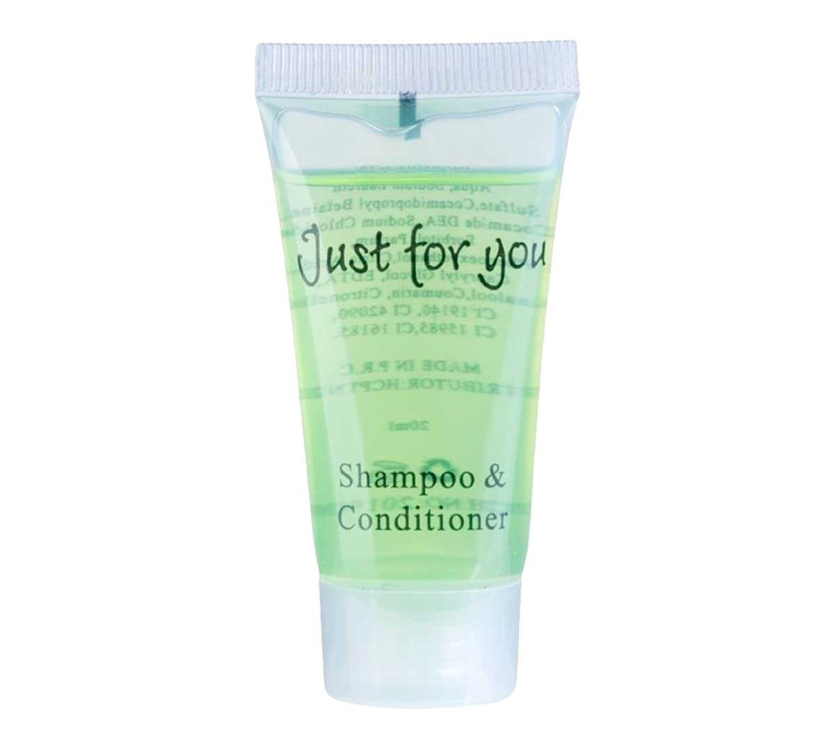 El Champú y Acondicionador Just for You 20 ml pertenece a la gama de amenities básicos para Hostelería y se presenta en tubos individuales de 20 ml, con diseño contemporáneo y uso cómodo para todo tipo de huéspedes.