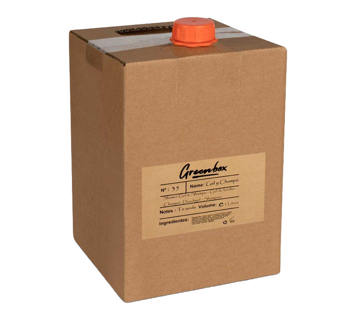 La recarga de Gel y Champú Té Verde en 1 Bag in Box se presenta en formato de 5 litros con sistema integrado de dosificación, pensada para rellenar dispensadores profesionales de forma limpia, rápida y segura.
