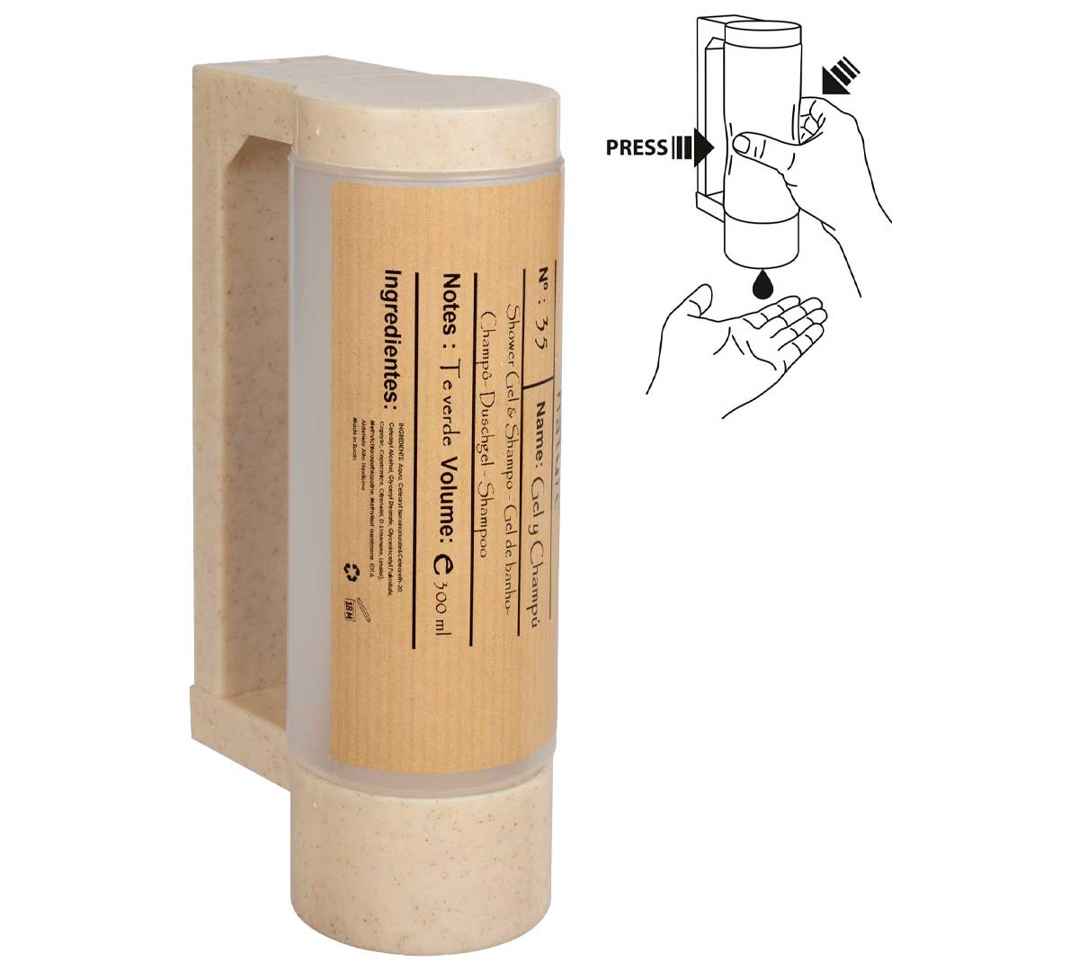 El soporte con botella dispensadora BIO para gel y champú admite envases de 400 ml y está fabricado en material resistente y sostenible, pensado para un uso intensivo en hostelería y alojamientos turísticos.