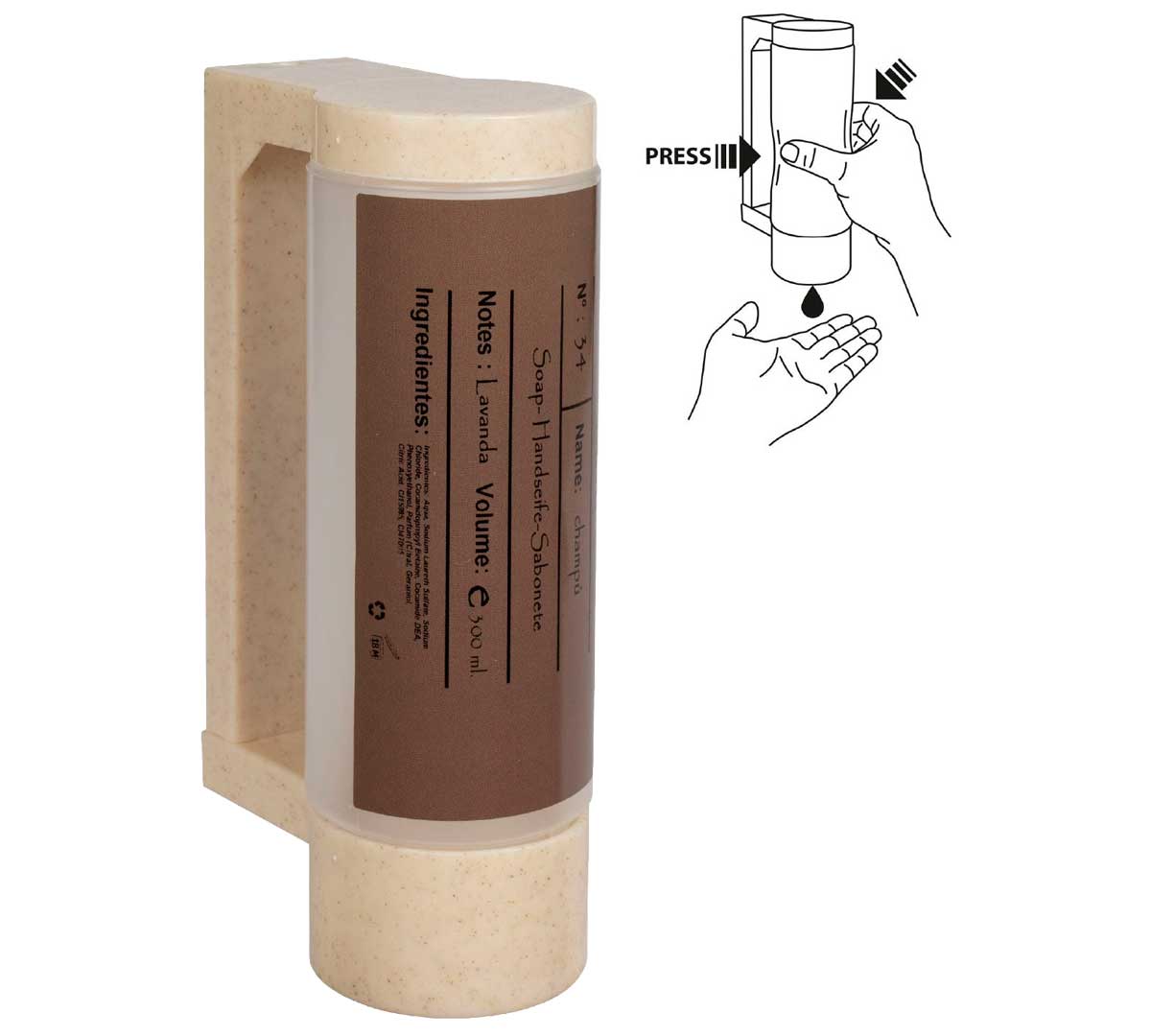 El soporte con botella dispensadora Bio para jabón de manos admite envases de 400 ml y está fabricado en material resistente y sostenible, pensado para un uso intensivo en baños profesionales de hostelería.
