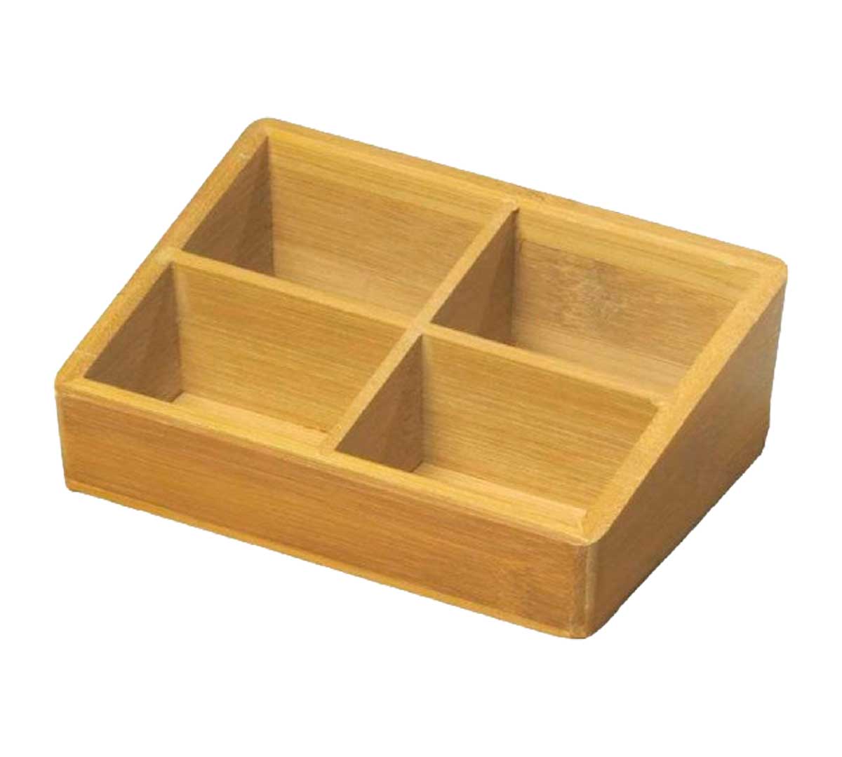 Bandeja de suministros para hotel fabricada en bambú natural con compartimentos, diseñada para organización eficiente de amenities en baños con enfoque ecológico.