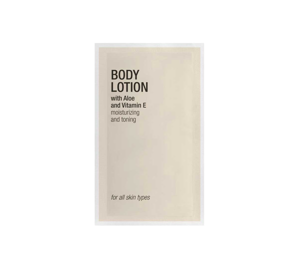 Loción corporal profesional en sobre monodosis de 10 ml con aloe vera y vitamina E, diseñada para hidratación rápida y uso individual en hoteles con enfoque sostenible.