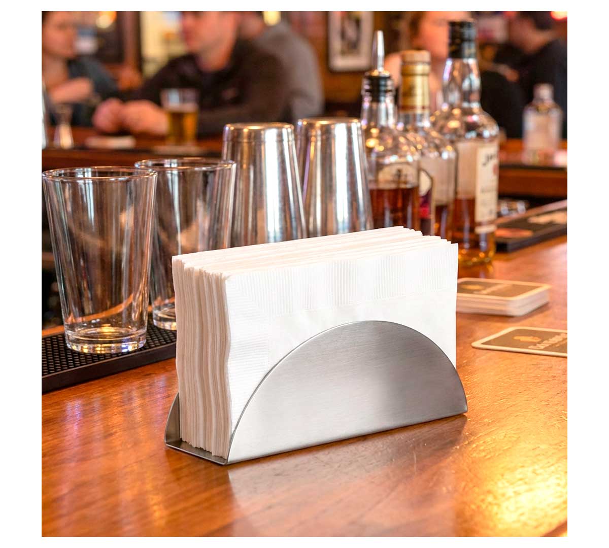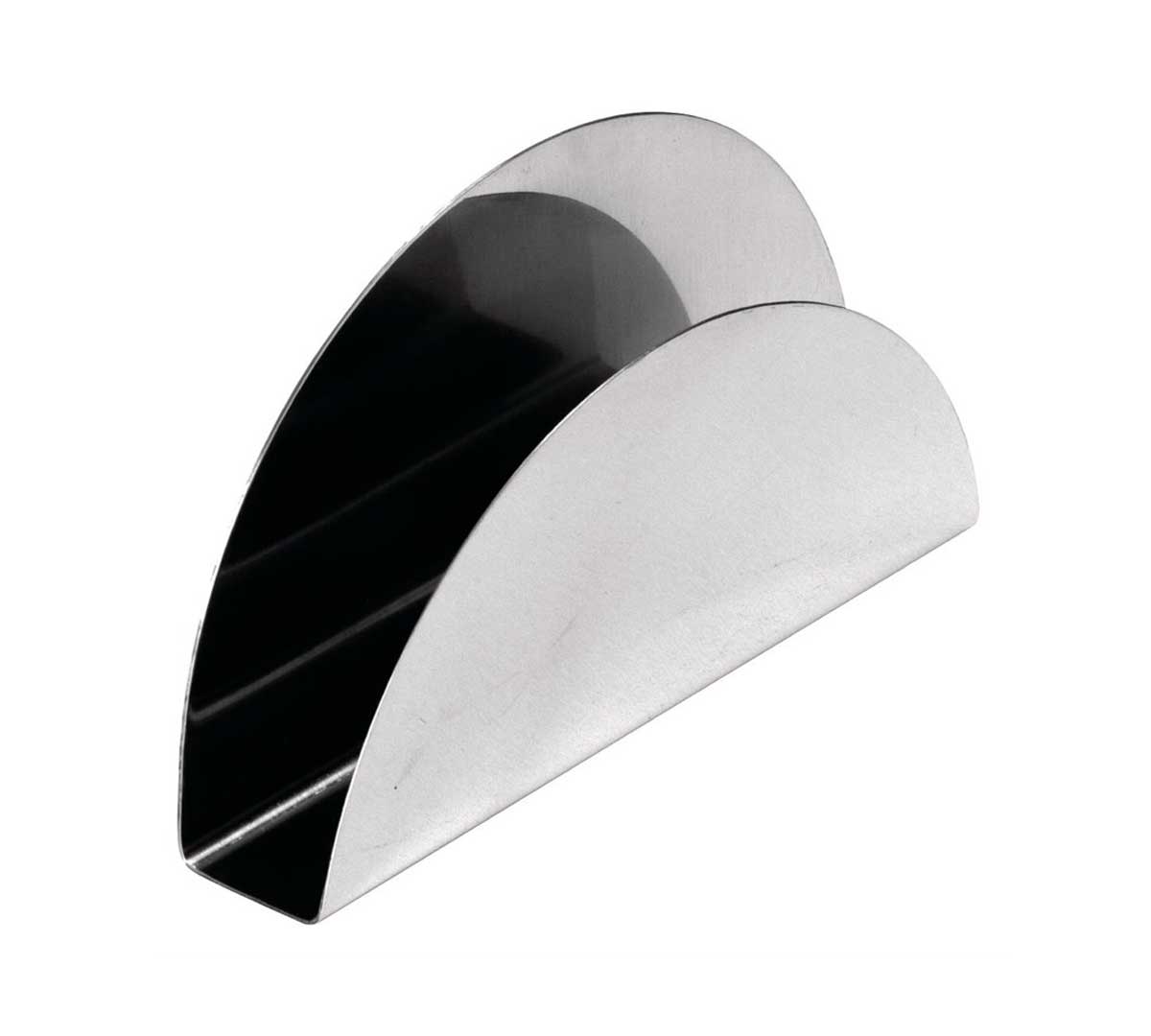 Servilletero Olympia de acero inoxidable con diseño curvo tipo media luna, pensado para mantener las servilletas ordenadas y accesibles en mesas y barras. Compacto, resistente y elegante, ideal para bares, restaurantes y servicios profesionales.