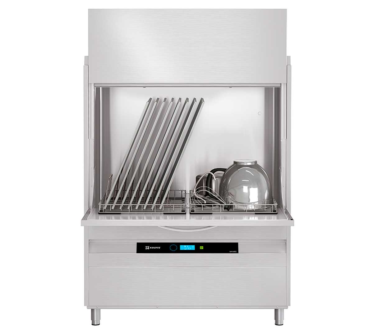 Lavautensilios profesional con un sistema eficiente y duradero, que ahorra energía y detergente. Incluye dosificadores automáticos y pantalla LCD de cristal templado para un uso sencillo. Ofrece mayor capacidad con doble cesta apta para bandejas GN 1/1 y cacerolas de gran tamaño de hasta 83 cm. Incluye 1 cesta 60 x 67 cm, soporte cubiertos, cesta para bandejas 8 compartidos e inserción para bandejas.