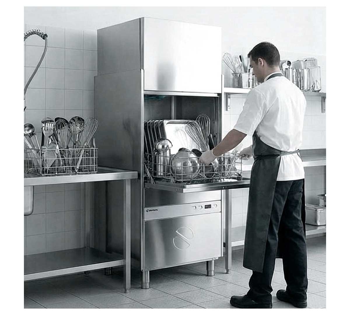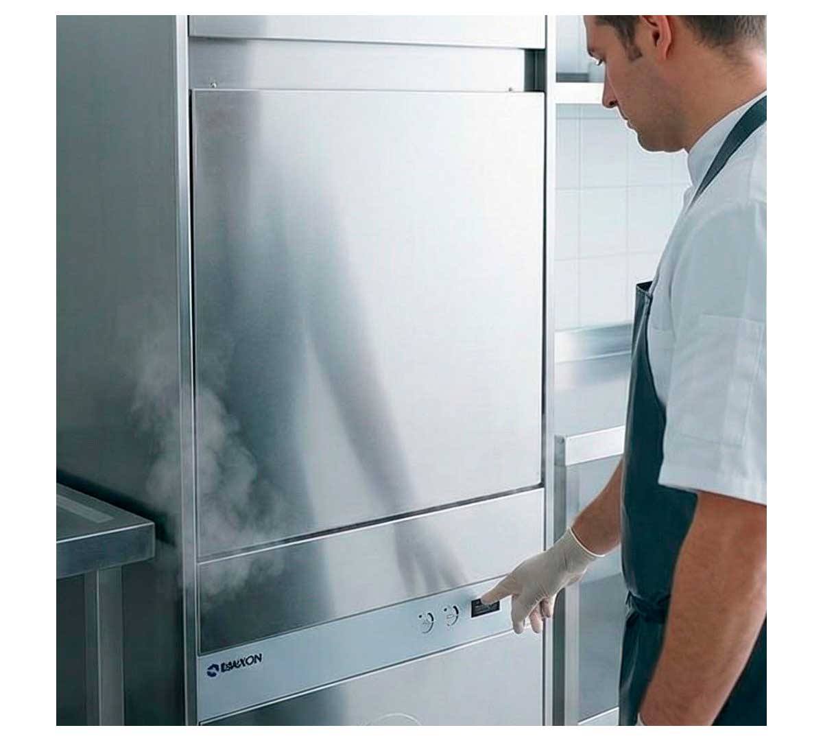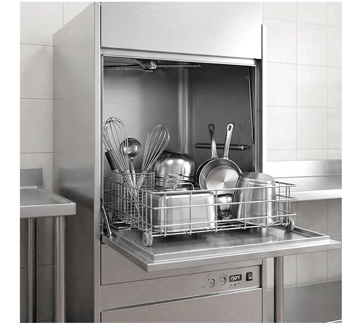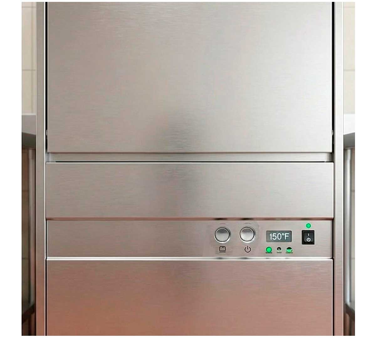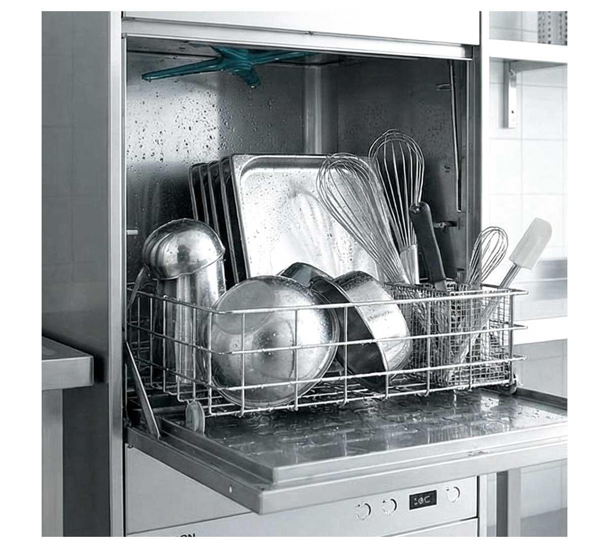 Lavautensilios monopared con 2 ciclos regulables. Con bomba de aclarado y visor para la temperatura. Incluye 1 cesta neutra de acero inoxidable.