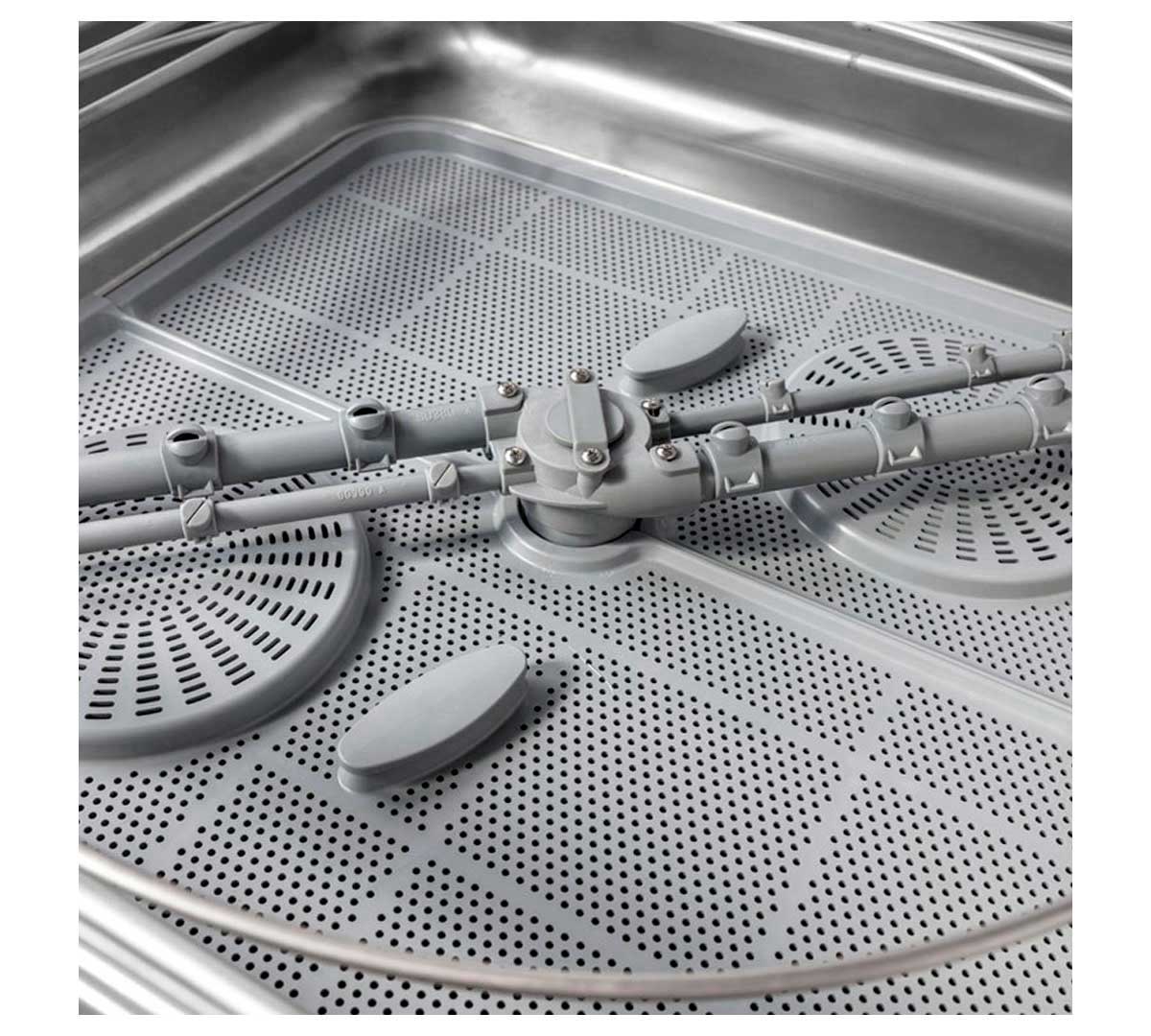 El sistema asegura una presión uniforme durante el lavado, lo que favorece una limpieza homogénea y eficiente de toda la carga, incluso en ciclos cortos ajustables entre 90 y 120 segundos.