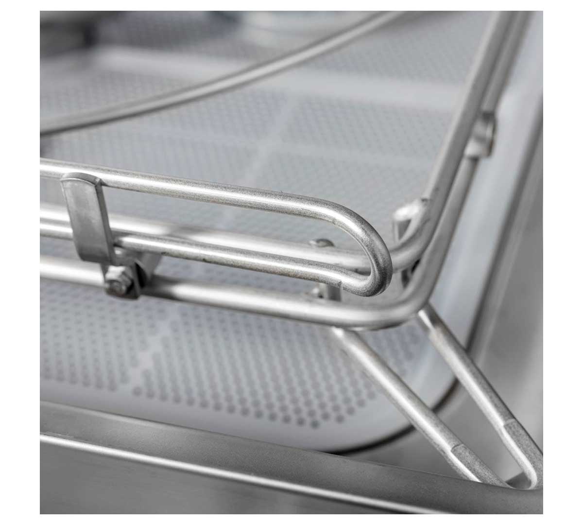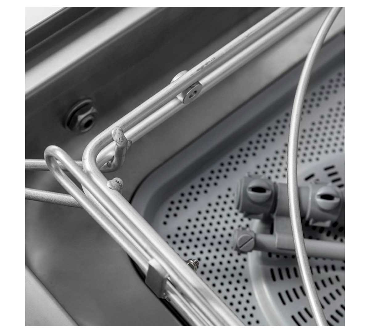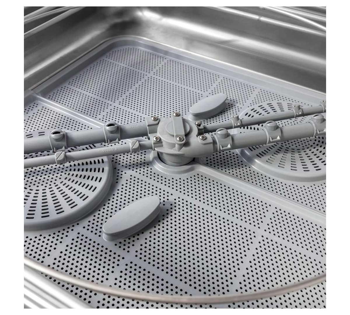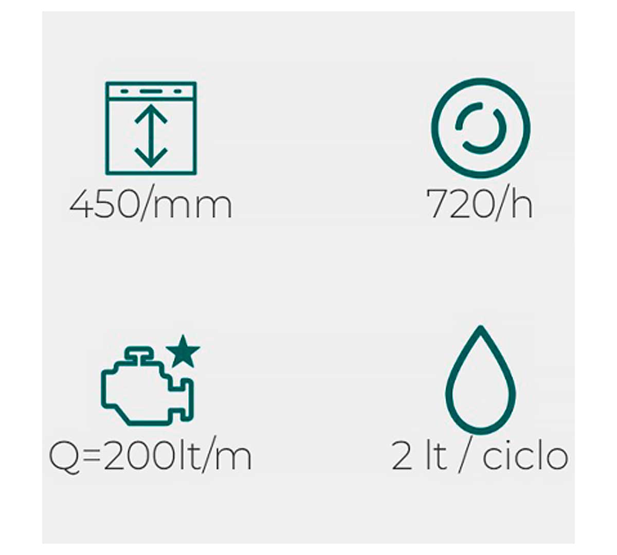 Fabricada en acero inoxidable 304, con dosificador peristáltico, bomba de desagüe, acceso frontal y cuba higiénica de fácil limpieza. Temperatura de lavado fija y aclarado ajustable.