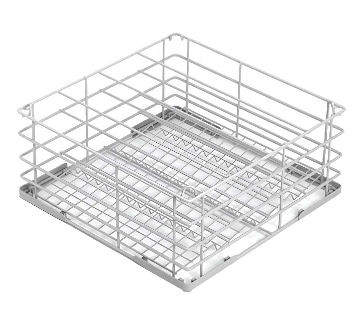 Cesta de acero con recubrimiento plástico. Diseñada para vasos de hasta 8,5 cm de diámetro y 18 cm de altura. Con 4 filas inclinadas para un lavado eficiente y seguro.