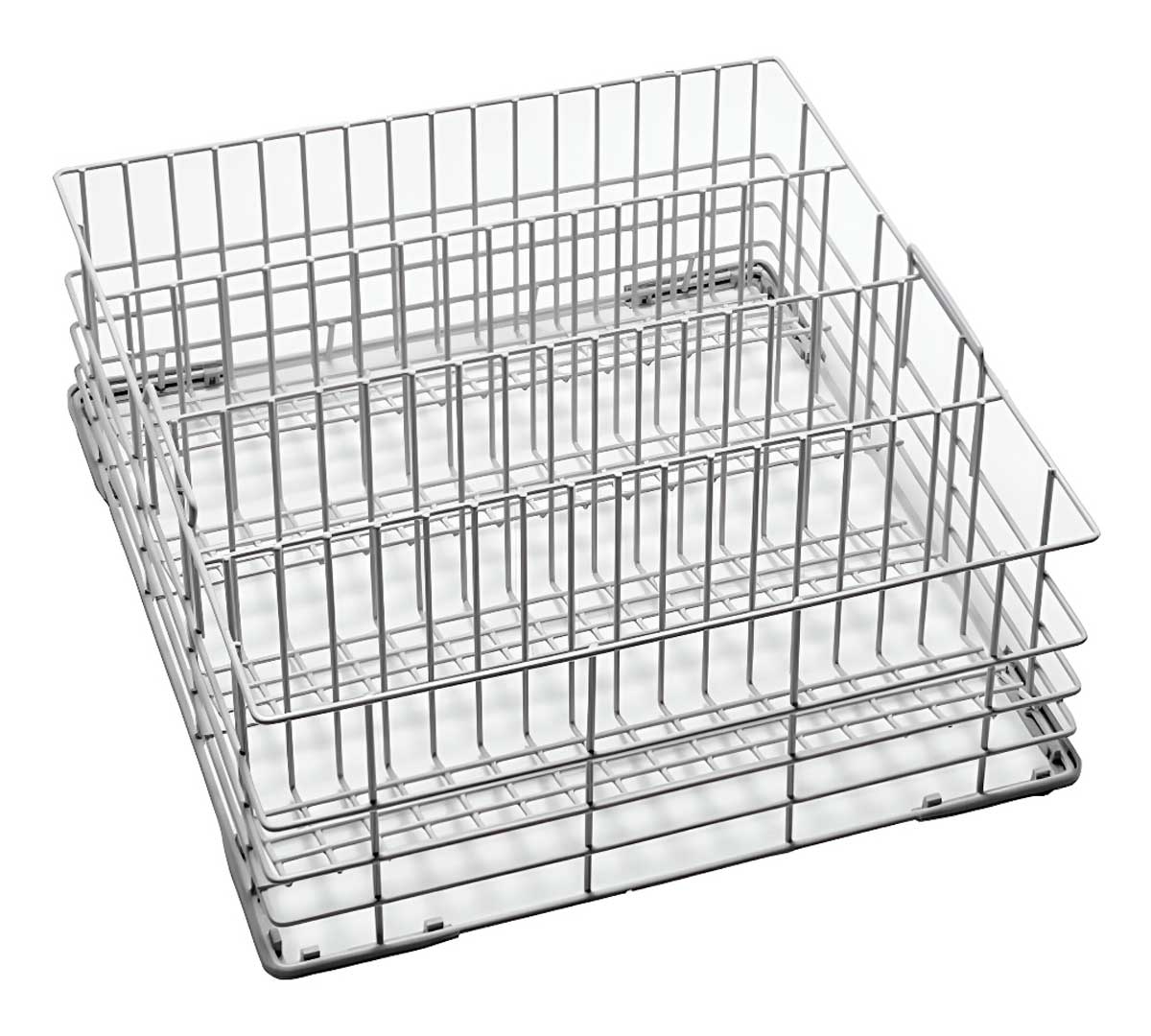 Cestas de acero con recubrimiento plástico. Diseñadas para lavado eficiente de vasos. Disponen de filas inclinadas para diferentes alturas y diámetros, optimizando la carga y el secado.