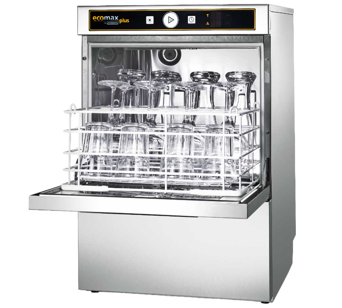 Lavavasos profesional bajo mostrador de alto rendimiento para bares, hoteles y restaurantes con elevada rotación. Capaz de lavar hasta 60 cestas por hora con cesta 40 x 40 cm y altura de carga ampliada para vasos altos. Se ofrece en versión completamente equipada de serie y opción con descalcificador integrado. Aporta mayor potencia, confort y durabilidad frente a la gama ecomax estándar.