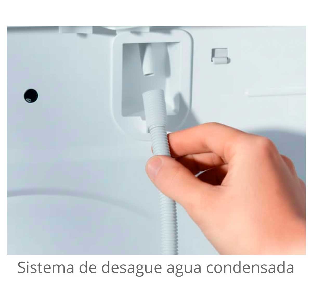 La secadora bombea el agua condensada hacia la parte trasera mediante una manguera de desagüe. Se recomienda instalar válvula antirretroceso si el extremo está sumergido para evitar retornos o daños.