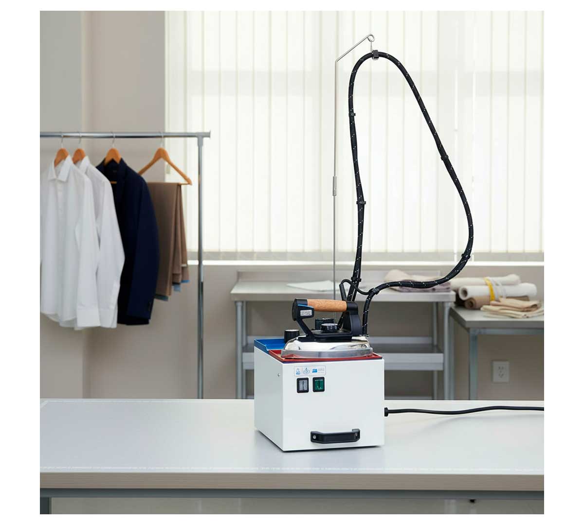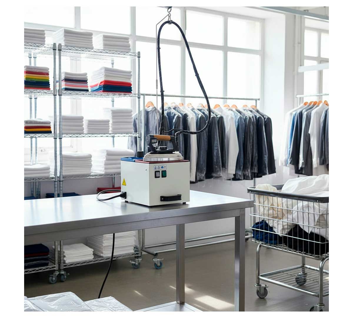 Centro de planchado eléctrico de uso profesional. Fabricado en acero inoxidable. Provisto de plancha vaporizante y caldera con capacidad de 5 litros. Con tres dispositivos de seguridad en la caldera e indicador del nivel de agua.