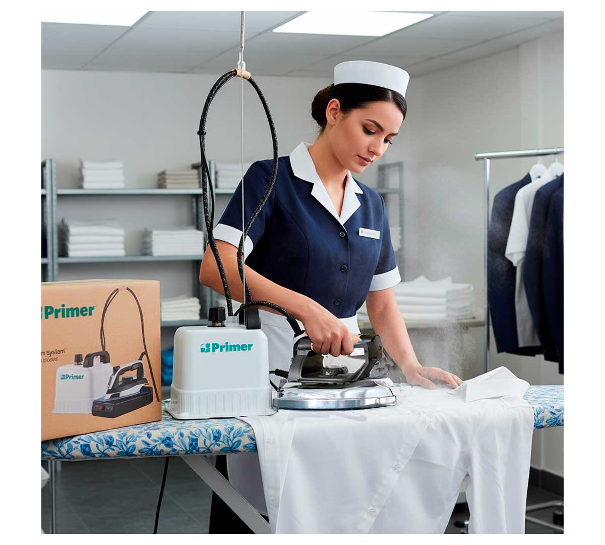Generador de vapor semi-industrial con caldera en aleación de aluminio. Disponible con carro y mesa plegable opcional. Facilita el acabado a mano de prendas de todo tipo. La caldera tiene una capacidad de 1,8 litros.