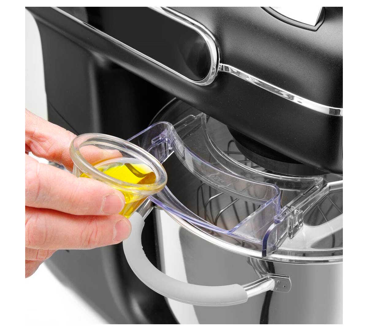 La tapa transparente del cuenco incluye un canal especial que facilita la incorporación de ingredientes en marcha, evitando derrames y manteniendo limpia la zona de trabajo.
