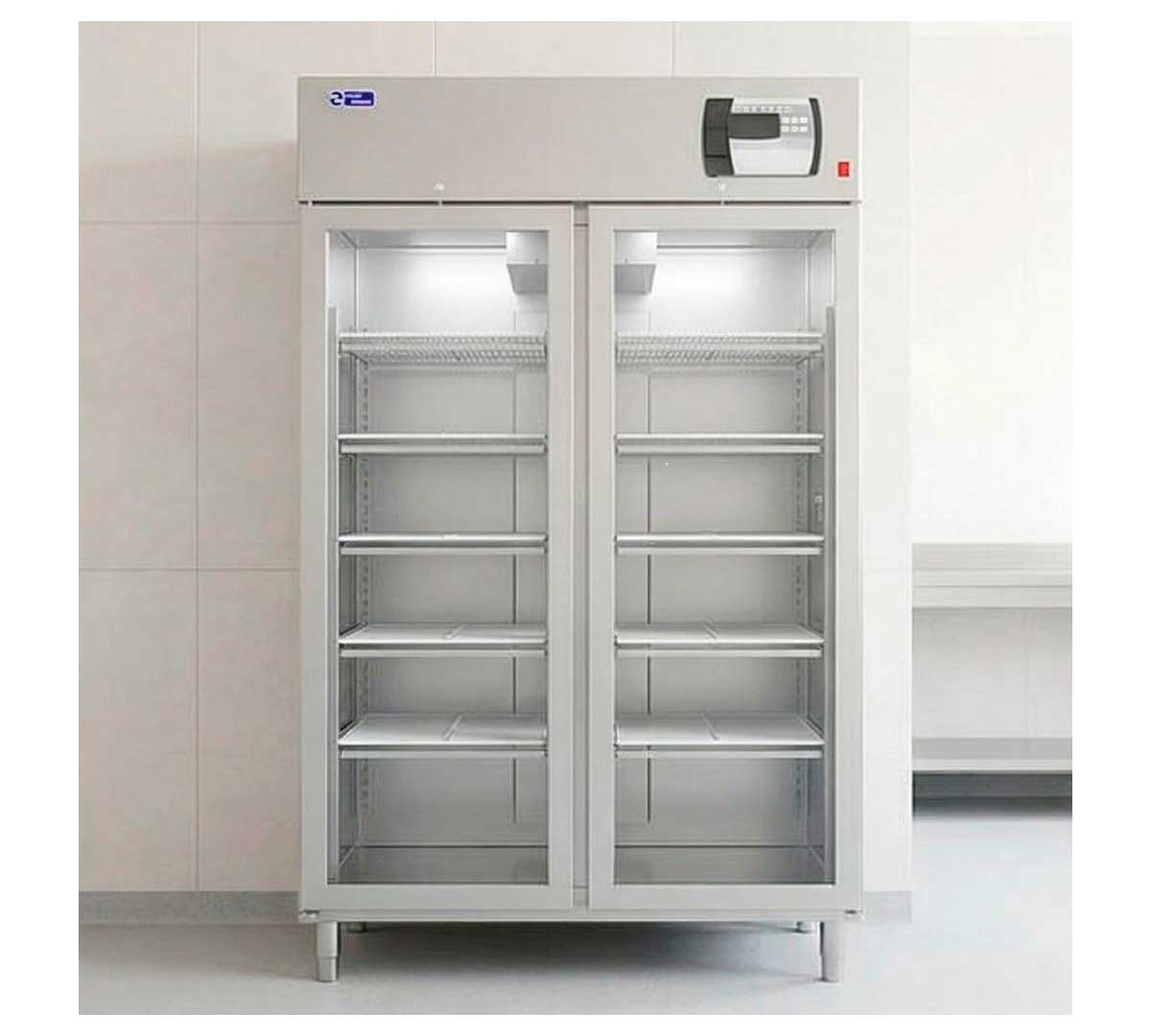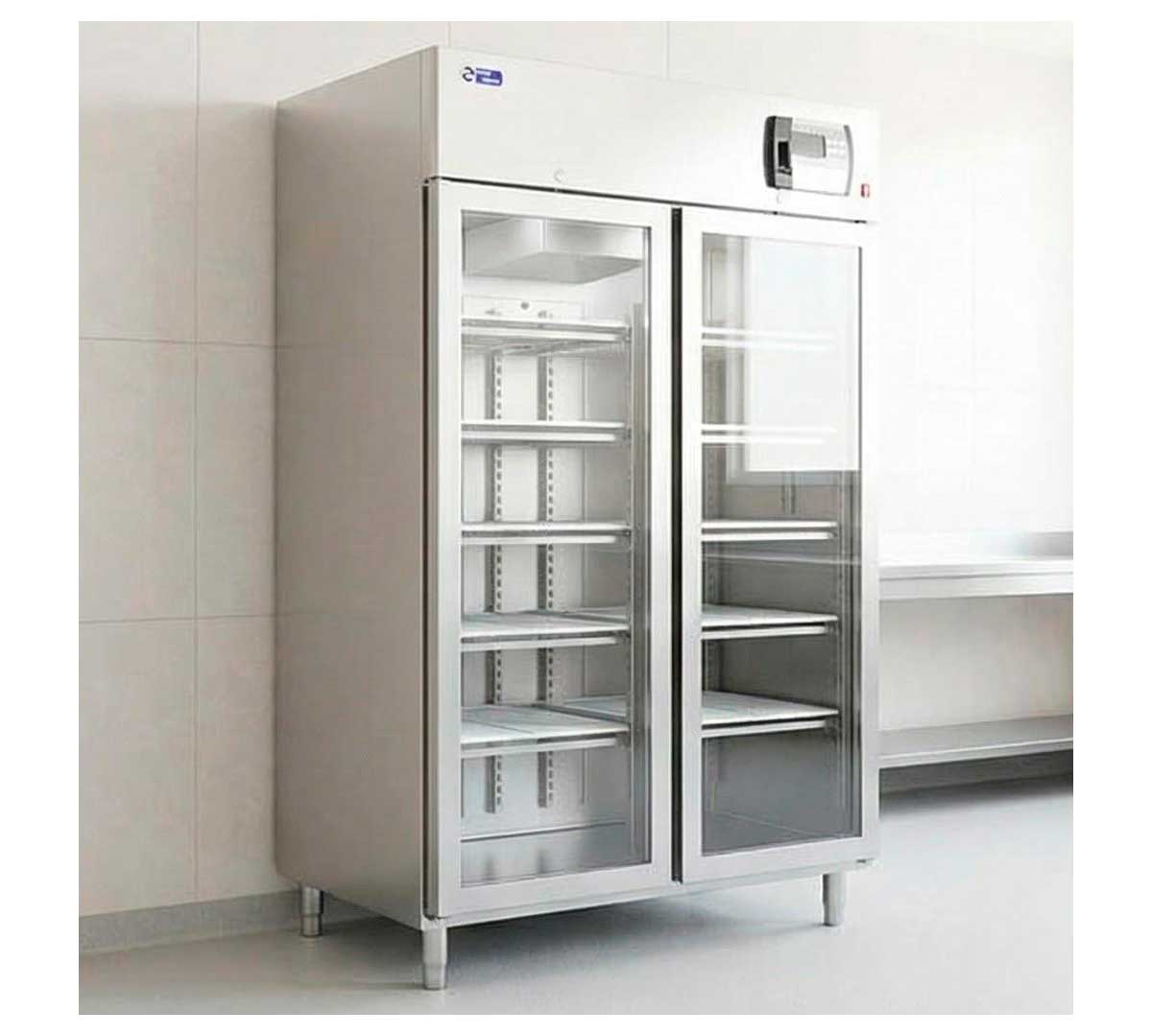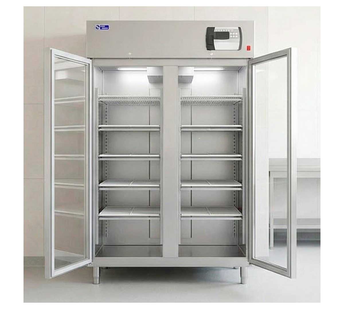 Este modelo de armario secadero de 1 puerta, es ideal para queserías y tiendas especializadas. Tiene una capacidad de 920 litros. Equipado con 2 puertas de triple cristal, 10 estantes y 10 bandejas recoge suero.