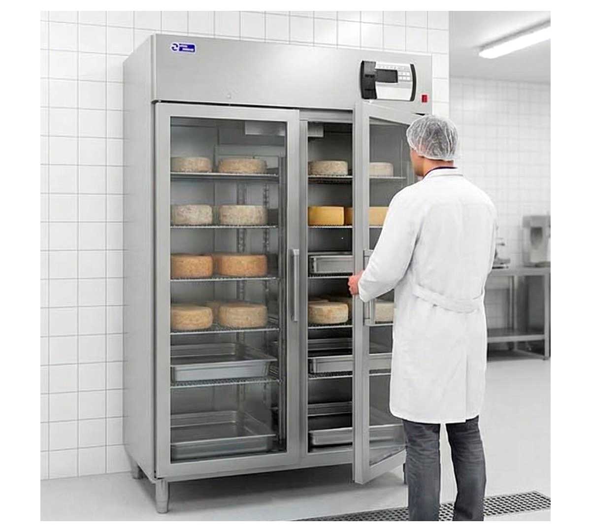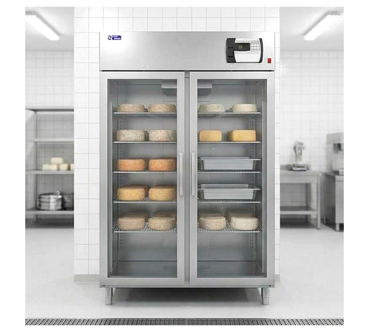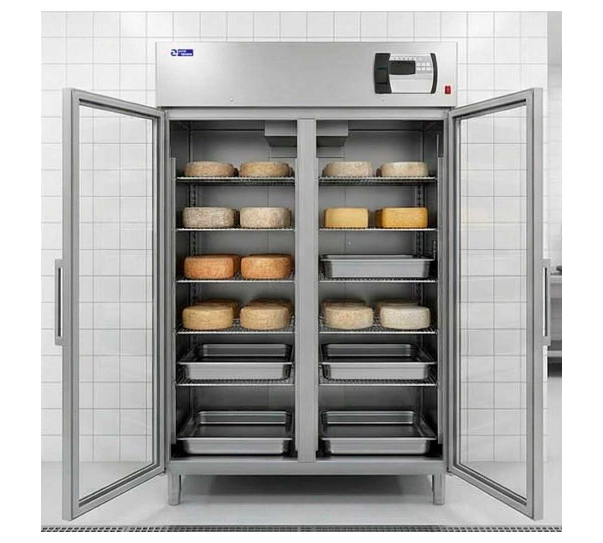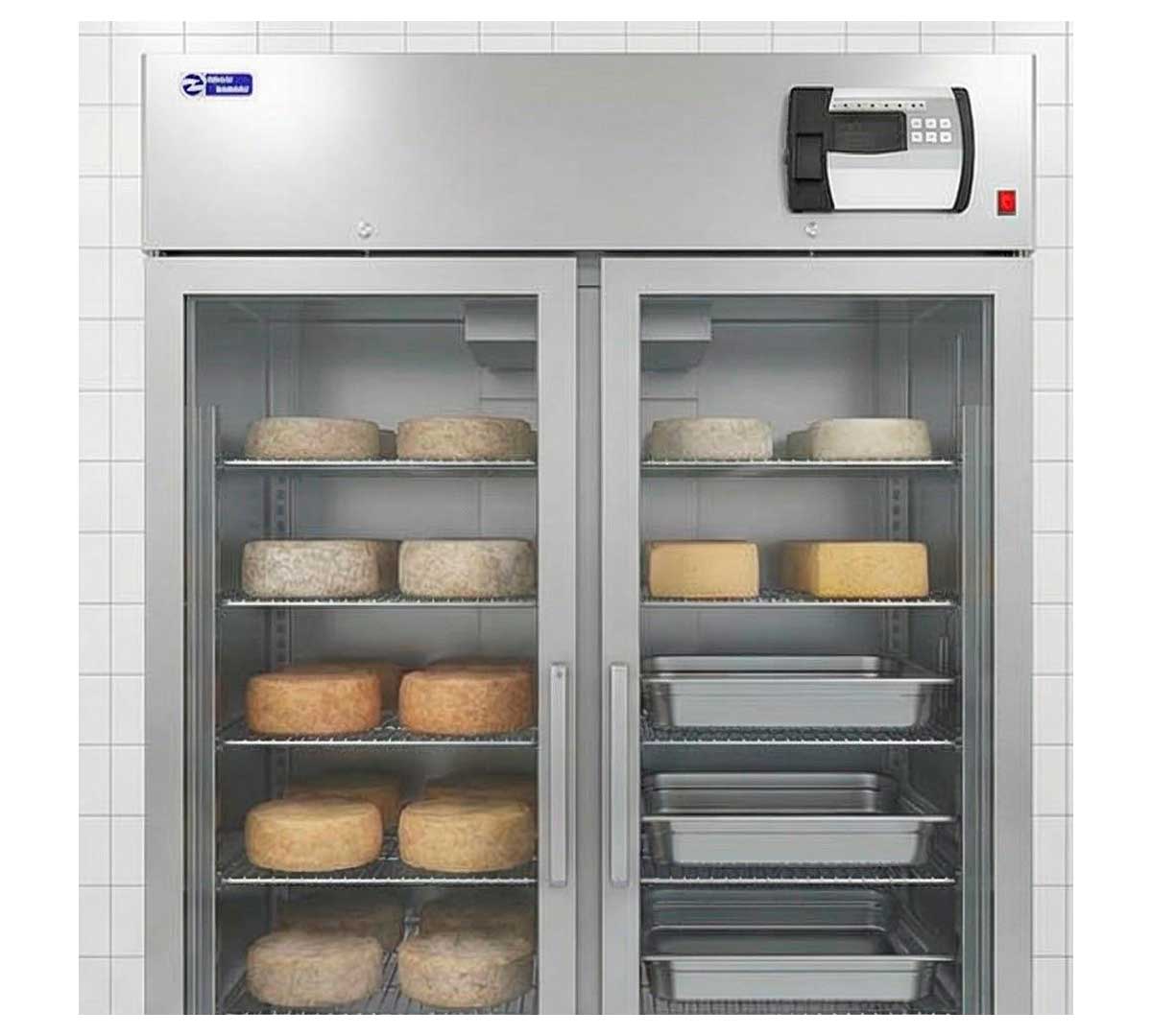 Armario especial para el secado y curado de quesos. Equipado con 2 puertas de triple cristal y refrigerado por aire. Capacidad para 10 parrillas y 10 bandejas recoge suero. Temperatura 0/ +30 ºC.