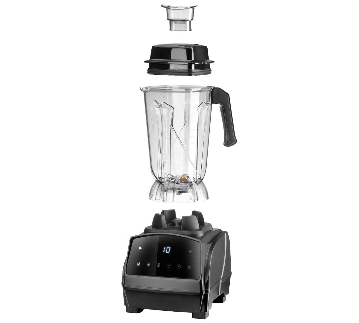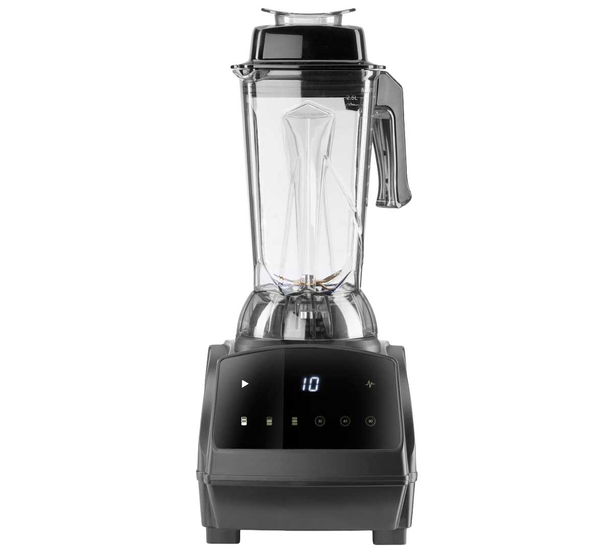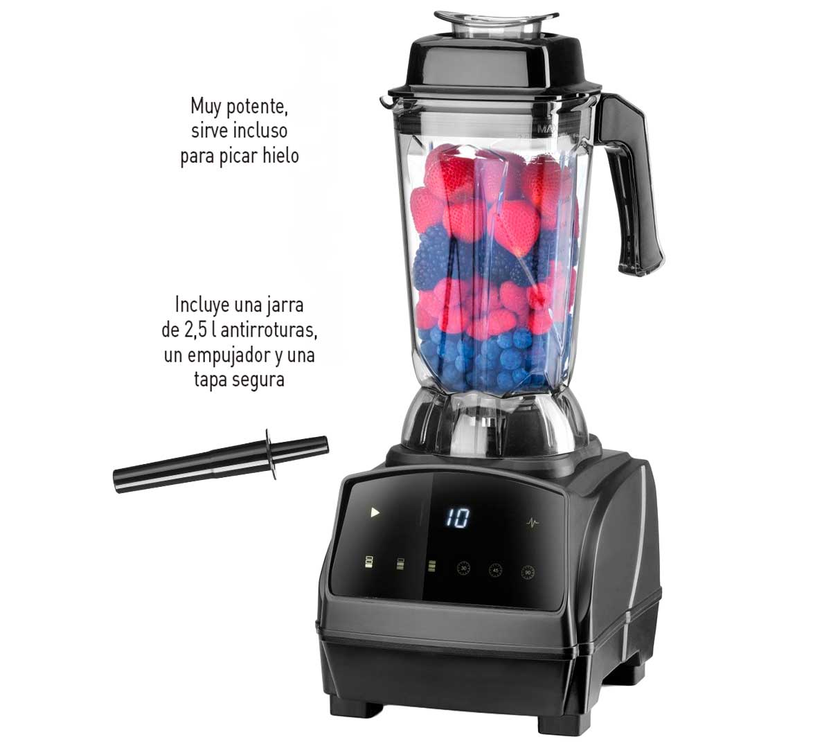 Batidora de vaso con pantalla digital. Modelo muy potente, sirve incluso para picar helo. Tiene 3 niveles de velocidad y 3 ajustes del temporizador. Las cuchillas son de acero inoxidable con revestimiento de titanio. Incluye jarra extraíble fabricada en policarbonato o tritán libre de BPA y empujador de polipropileno. No es apta para un uso continuado.