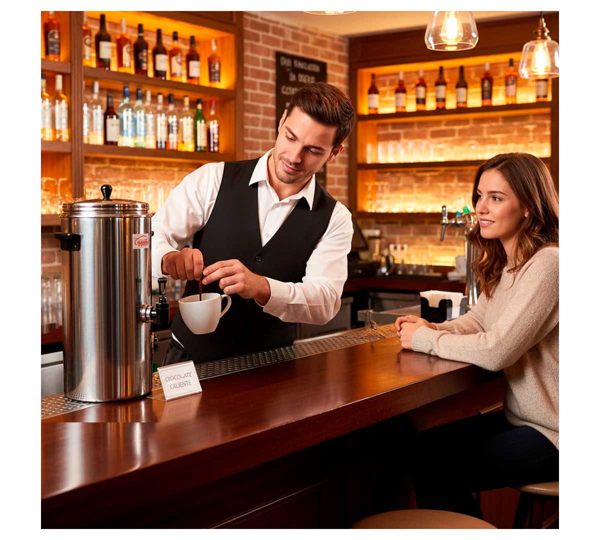 Termo de 9 litros para hacer, conservar y servir chocolate. Remueve continuamente el producto y mantiene su textura. Dispone de termostato regulable y grifo de doble posición.