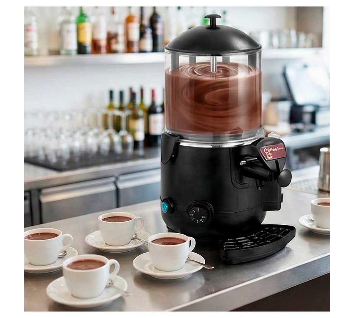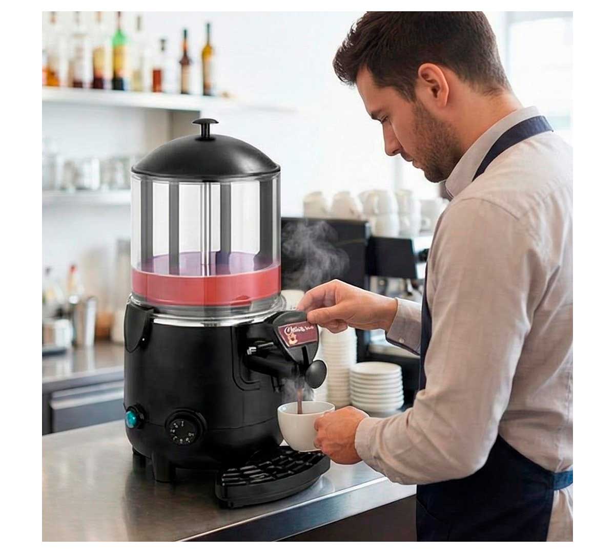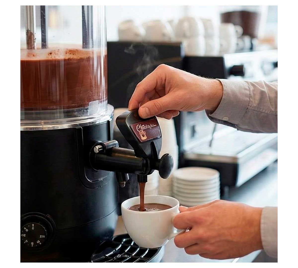 Esta chocolatera calienta al baño maría y dispensa cualquier tipo de bebida y en especial el chocolate. Está equipada con agitador que remueve continuamente el producto, para mantener su textura.