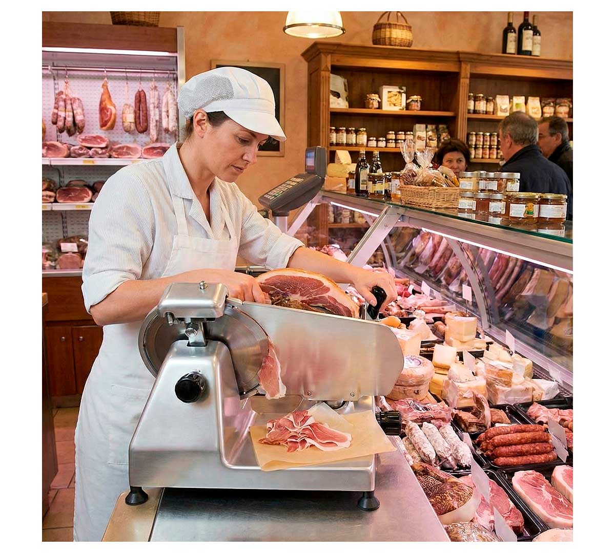 La Cortadora de Fiambre Basic Line de Corequip está equipada con varios dispositivos de seguridad: protectores sobre el plato, cubre cuchilla y sujeta mercancía.