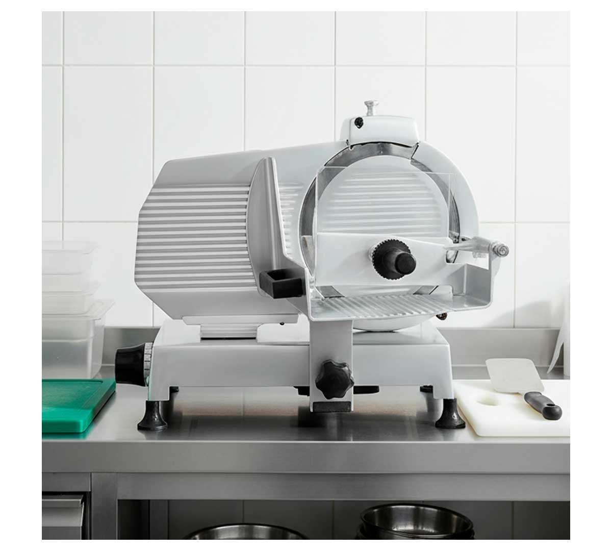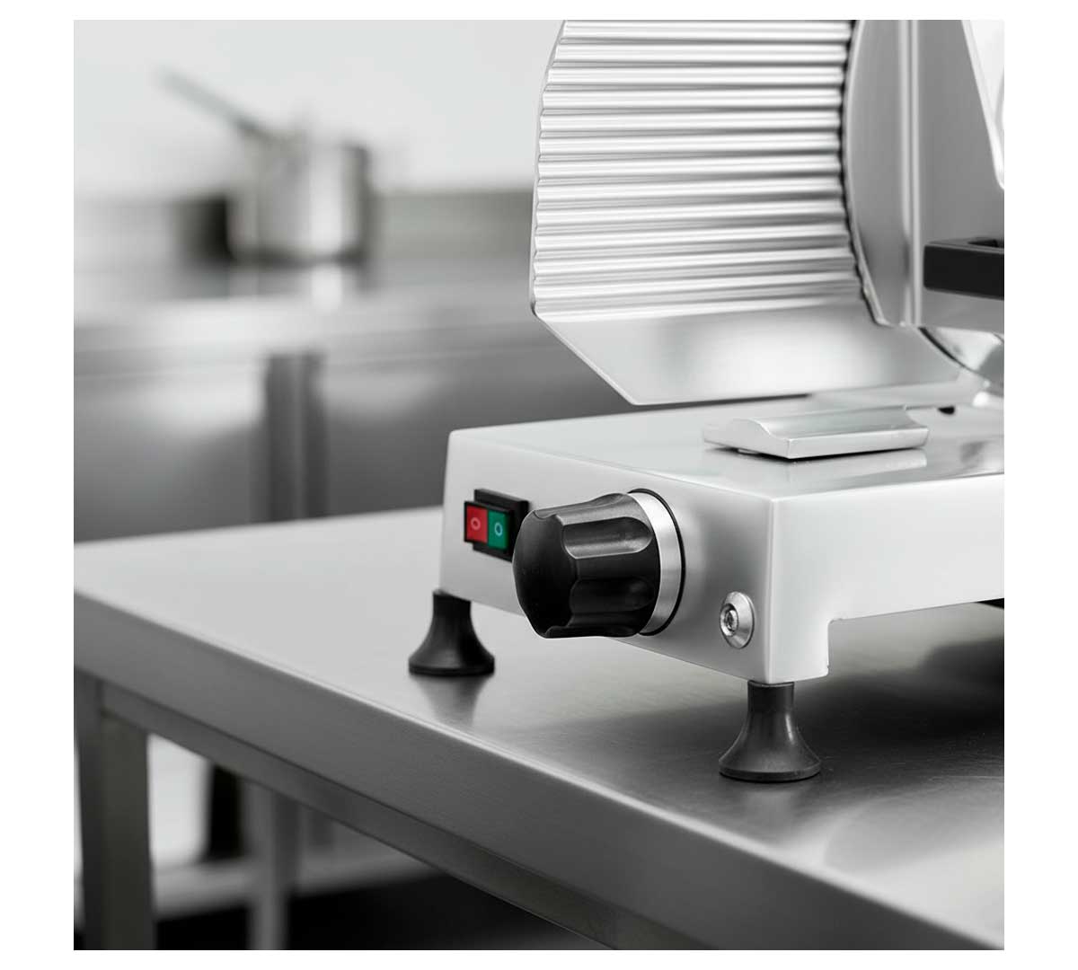 Cortadora vertical especialmente diseñada para cortar carne. Está fabricada en fundición de aluminio. Con regulador del espesor de corte.