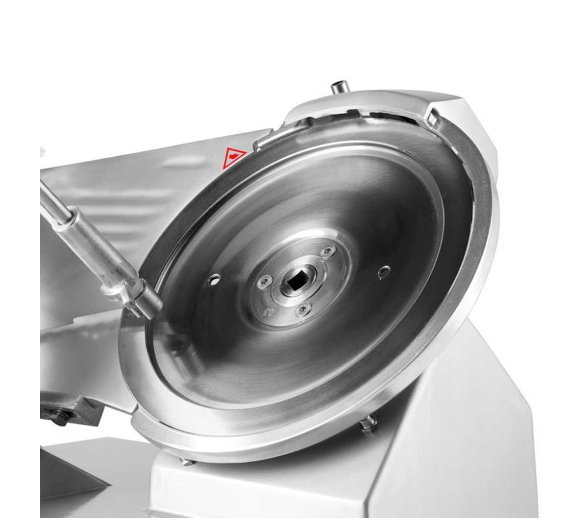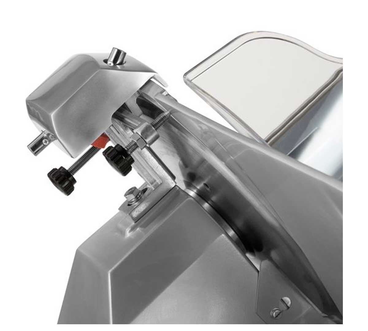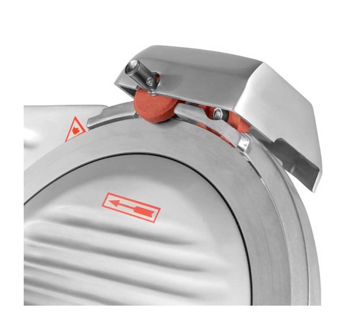 Cortadora de carne profesional disponible en 22, 25 y 30 cm de diámetro de cuchilla, con espesor regulable de 1 a 12 mm y construcción en aluminio anodizado. Sistema de cuchilla de acero inoxidable endurecido con afilador integrado. Diseñada para charcutería y hostelería profesional de uso medio e intensivo.