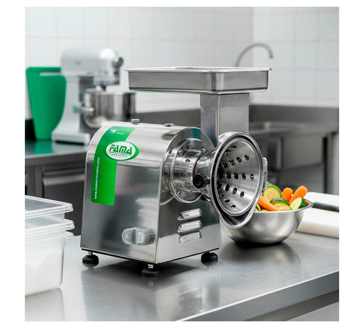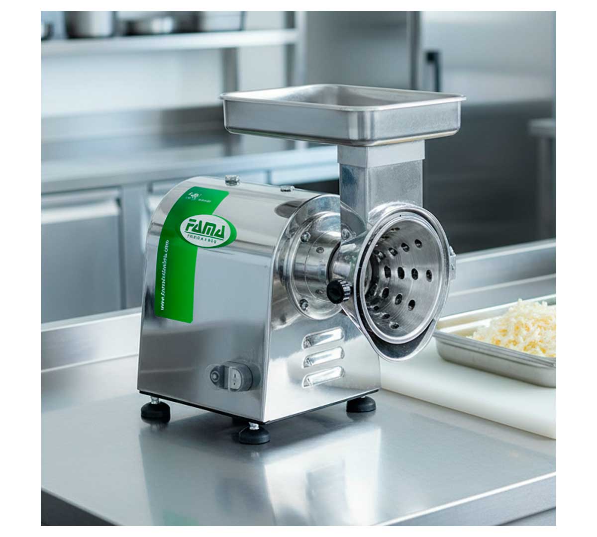 Equipo para rallar quesos blandos como el mozzarella y verduras. Fabricado con carcasa en acero inoxidable. Tiene un motor con una potencia de 1 HP. Incluye cono rallador de 7 mm. Recomendamos añadir de forma opcional conos para quesos duros, rallador y laminador de verduras.