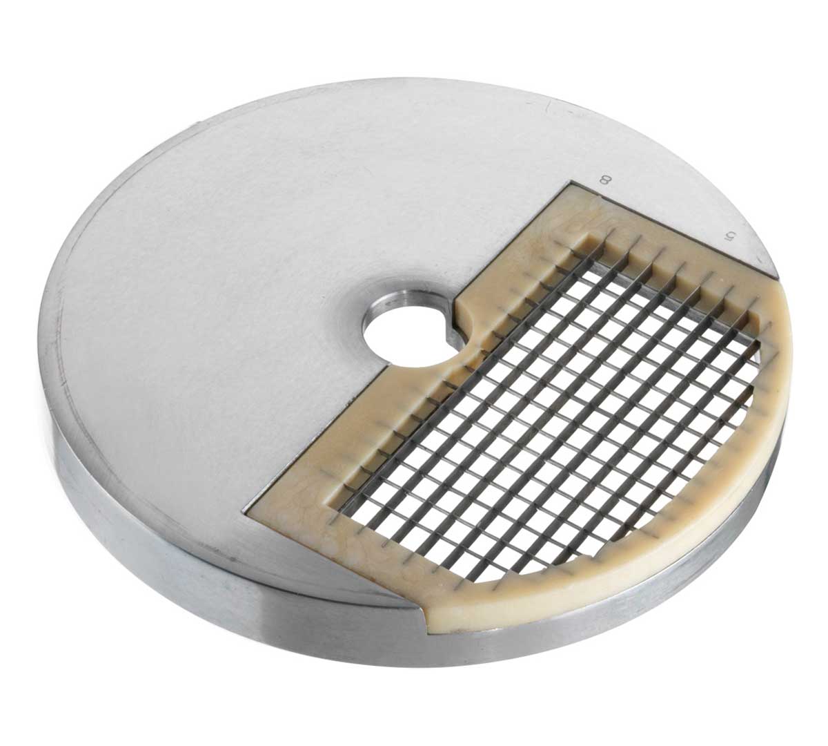 Máquina diseñada para cortar mozarella en cubitos. La carcasa es de acero inoxidable y el cuerpo central y la tapa de aluminio. La boca tiene unas medidas de 8 x 6,5 cm. Tiene microinterruptor de seguridad en la tapa y manija. El disco y la cuchilla no están incluidos, se vende como accesorios.